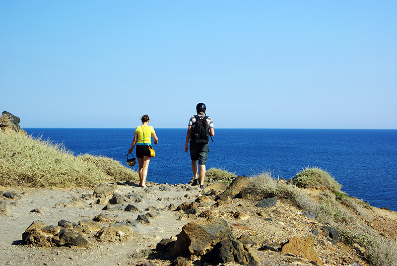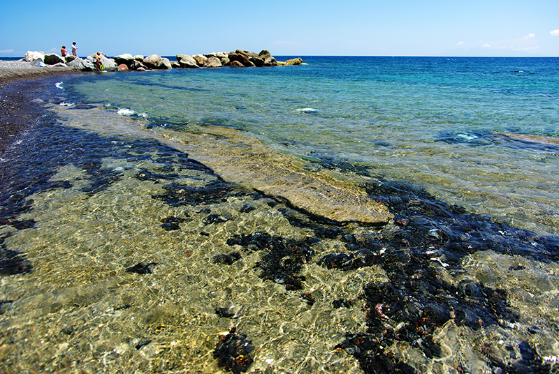从kamari车站下车,往海边走便是黑沙滩,海滩主要是黑色的鹅卵石构成,绵延数公里。六月份的时候海水还很冷,但是阳光已经把沙滩烤的很热了。在海滩上赤脚走路是很痛苦的事情,但是海还是很漂亮的。