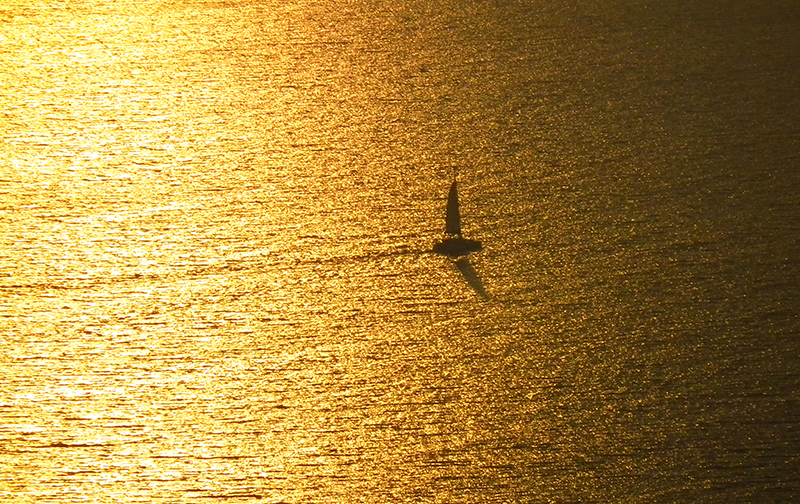 金色的阳光洒在海面上,一艘帆船徐徐驶过