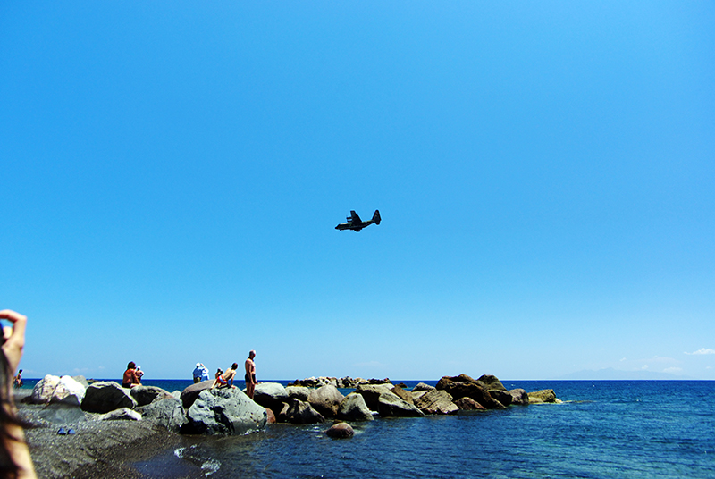 在我们躺在海滩上暖身体的时候,一架大型军用运输机从头顶盘旋而过,大家纷纷行注目礼。