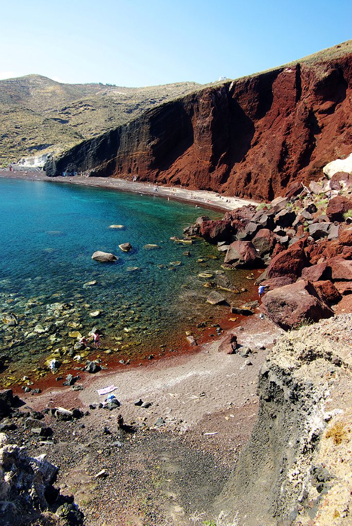 红沙滩在圣托里尼 南部的一个小峭壁下,需要翻山越岭才能到达。