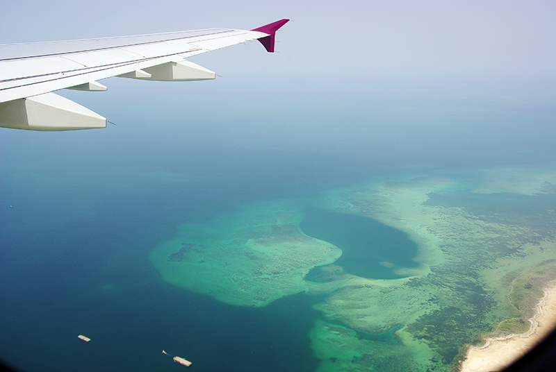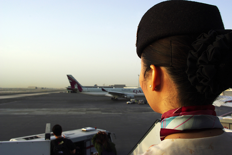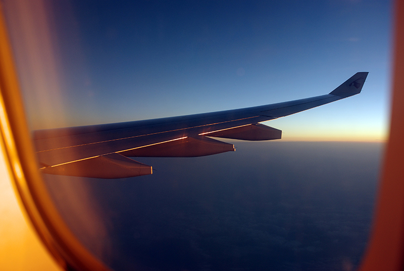 用完早饭后看了会儿电影,飞机便将落在了多哈 机场。波斯空姐美丽的脸庞映衬在朝阳 下,与一望无际的地平线和天边黄色的沙尘形成了扑面而来的异域风情。
