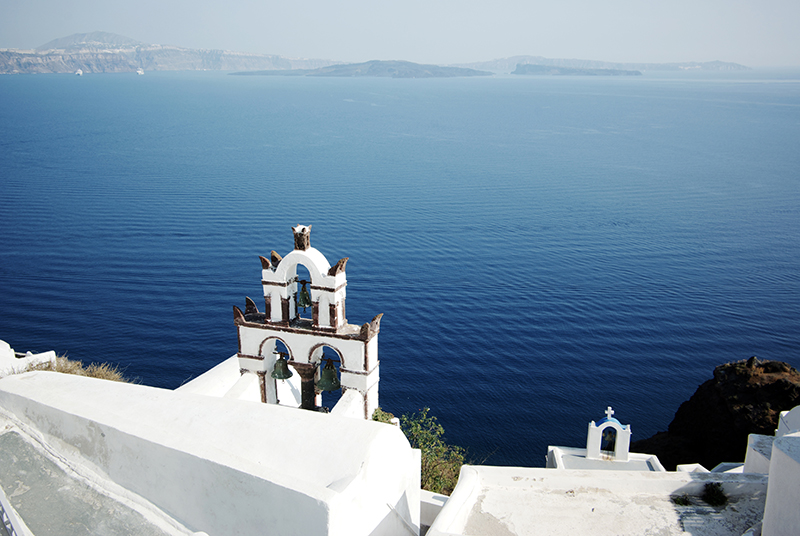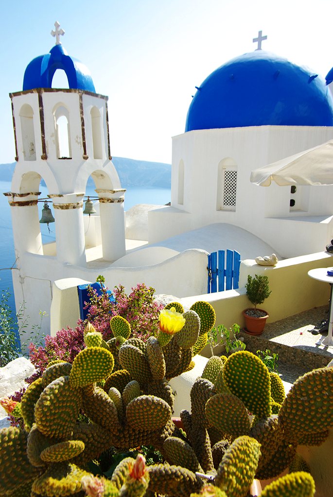 而Oia最有名的莫过于这几个点缀在雪白建筑群之间的蓝顶教堂。不知何人何时突发奇想,造就了这美轮美奂之景。