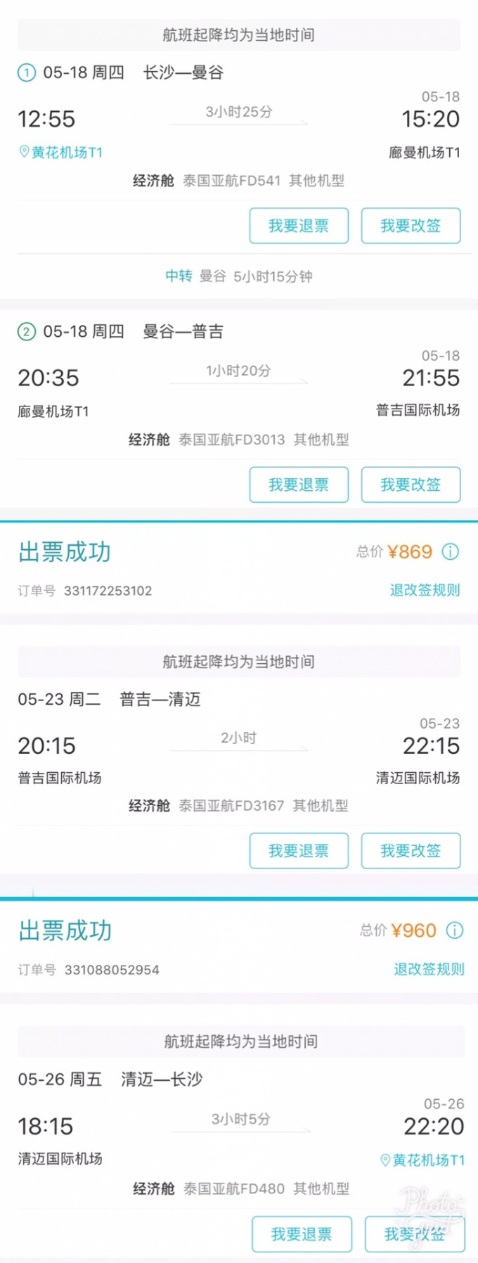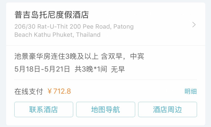 机票:因为大家的出发地都不同,各代理商价格都不一样。我是三月份订的机票,查询了官网和携程、飞猪(原阿里旅行),最后发现去哪儿加税最便宜。一看价格合适就下单了,每次各app的价格都不一样,大家记得比对。有旅行安排以后可以留意一段时间的价格浮动,合适就下手。国内任何地方飞泰国,往返不超过1700都是较为合适的。