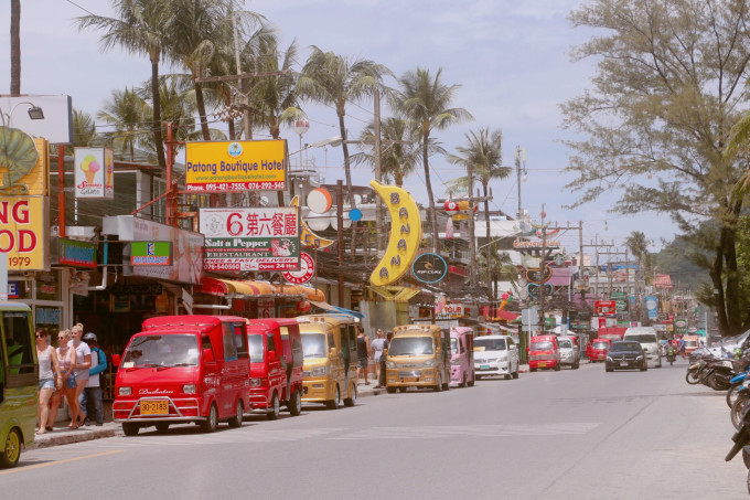走出餐厅就是芭东海滩著名的酒吧街,即使已经是中午了却还是比较安静。我们直穿走到了芭东海滩,刚到海滩就被劝说用600泰铢画了两个纹身,本来还可以便宜的,原本开价2000泰铢。如果你们也想画,记得500泰铢比较合适。阿诗画完就被衣服弄脏了,直接洗掉了。