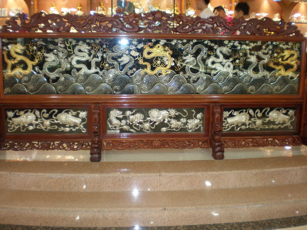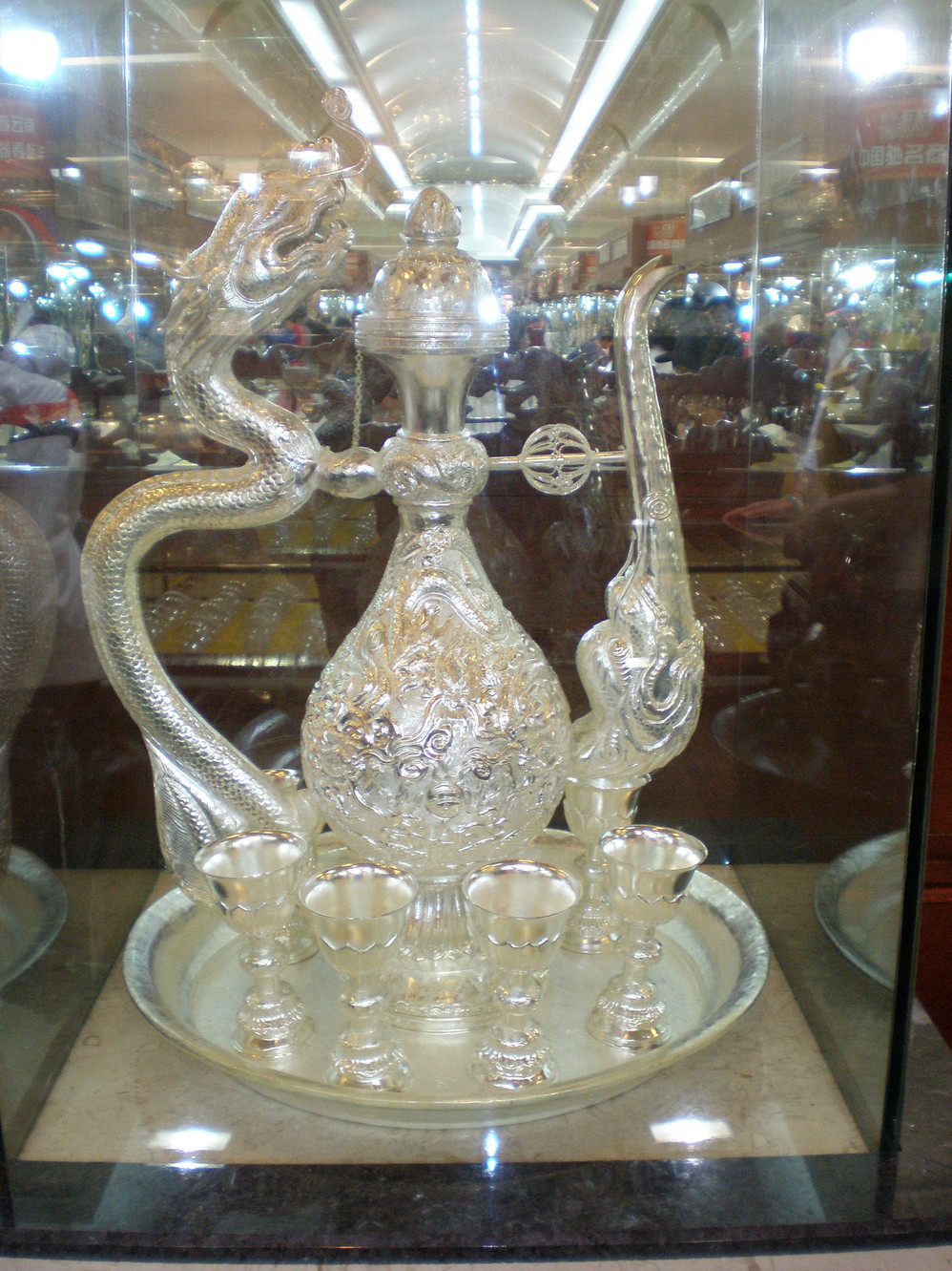 石寨子的镇店之宝---九龙 壶。当时../travel-scenic-spot/mafengwo/10062.html(美国 ) 就是从这支中国 送的礼物看出工艺水平,找到寸家的。这只壶就是拉丝工艺做出来的,银版不可能做出如此妩媚的造型,表面看不出来,如果看剖面就能看出是拉丝工艺盘出的形状。八只银杯与其相配,壶装满酒,倒进八只杯中,不多一滴,不少一滴。