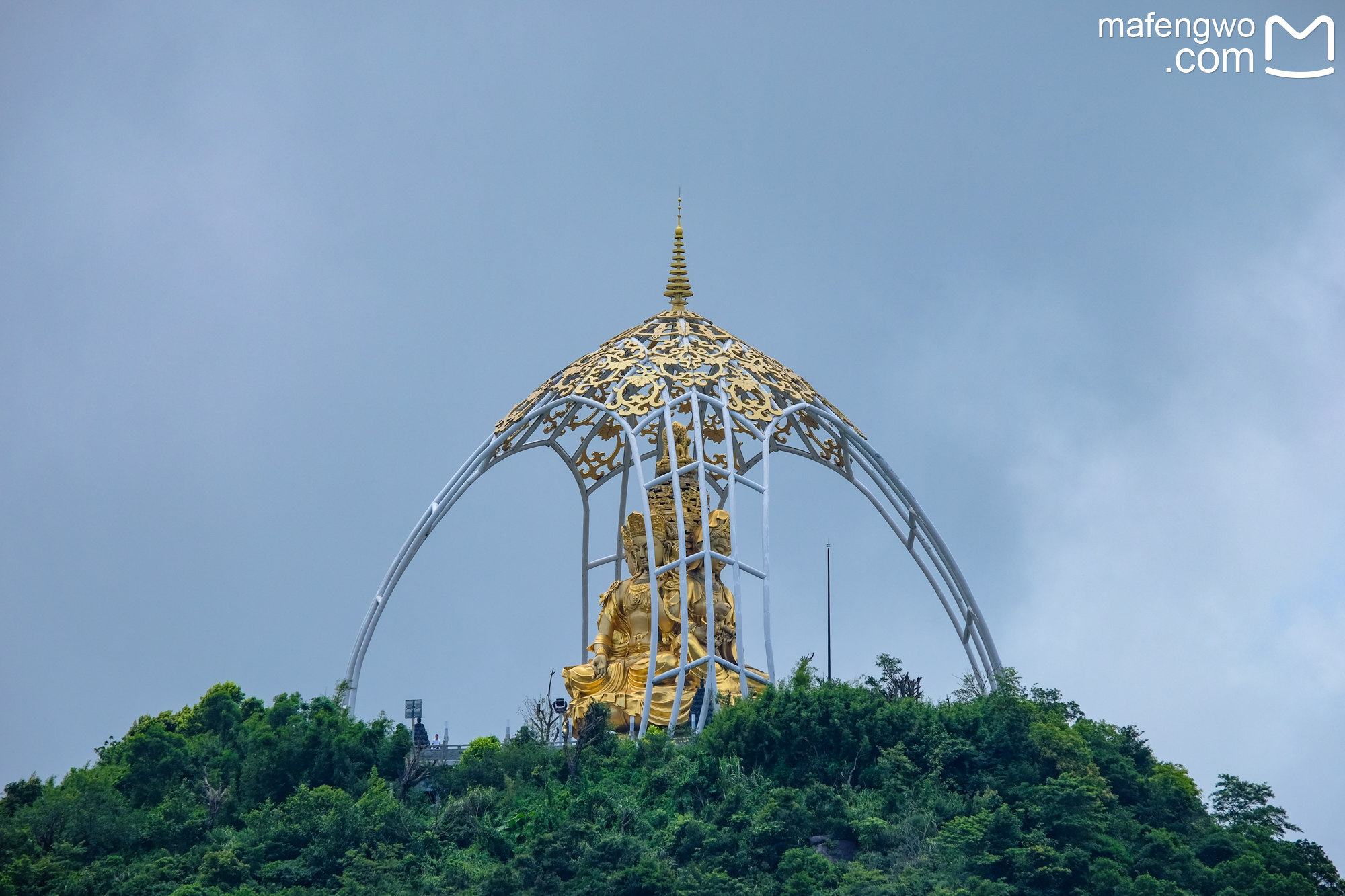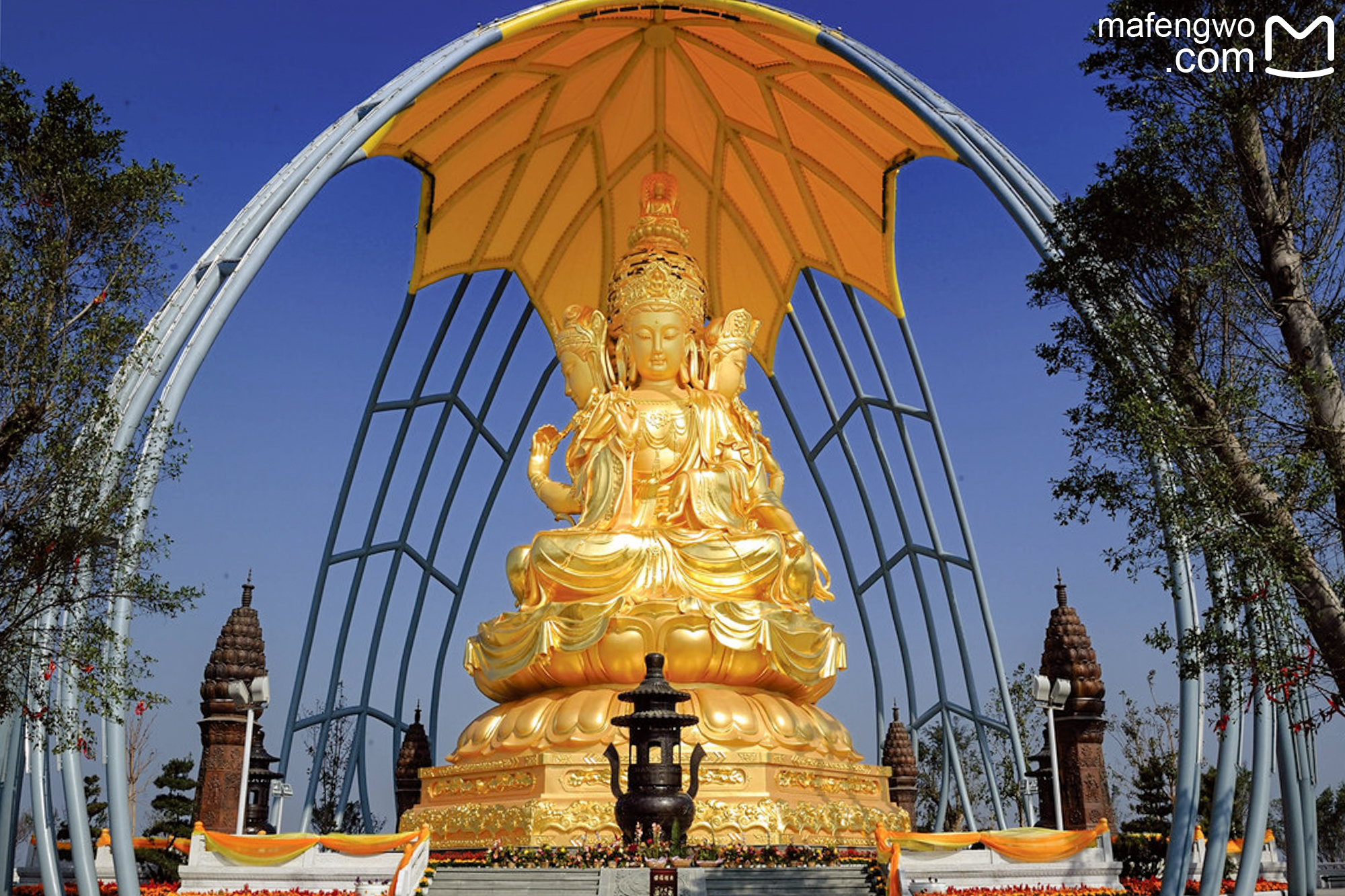观音座莲像高23.3米,采用158吨仿金铜铸造而成。观音座莲全像主题设计为四面观音:南面观音为 “圣观音”;北面观音为 “送子观音”;西面观音为 “莲华手菩萨”;东面观音为“圣观音”的主身形之一“世间尊观音”。