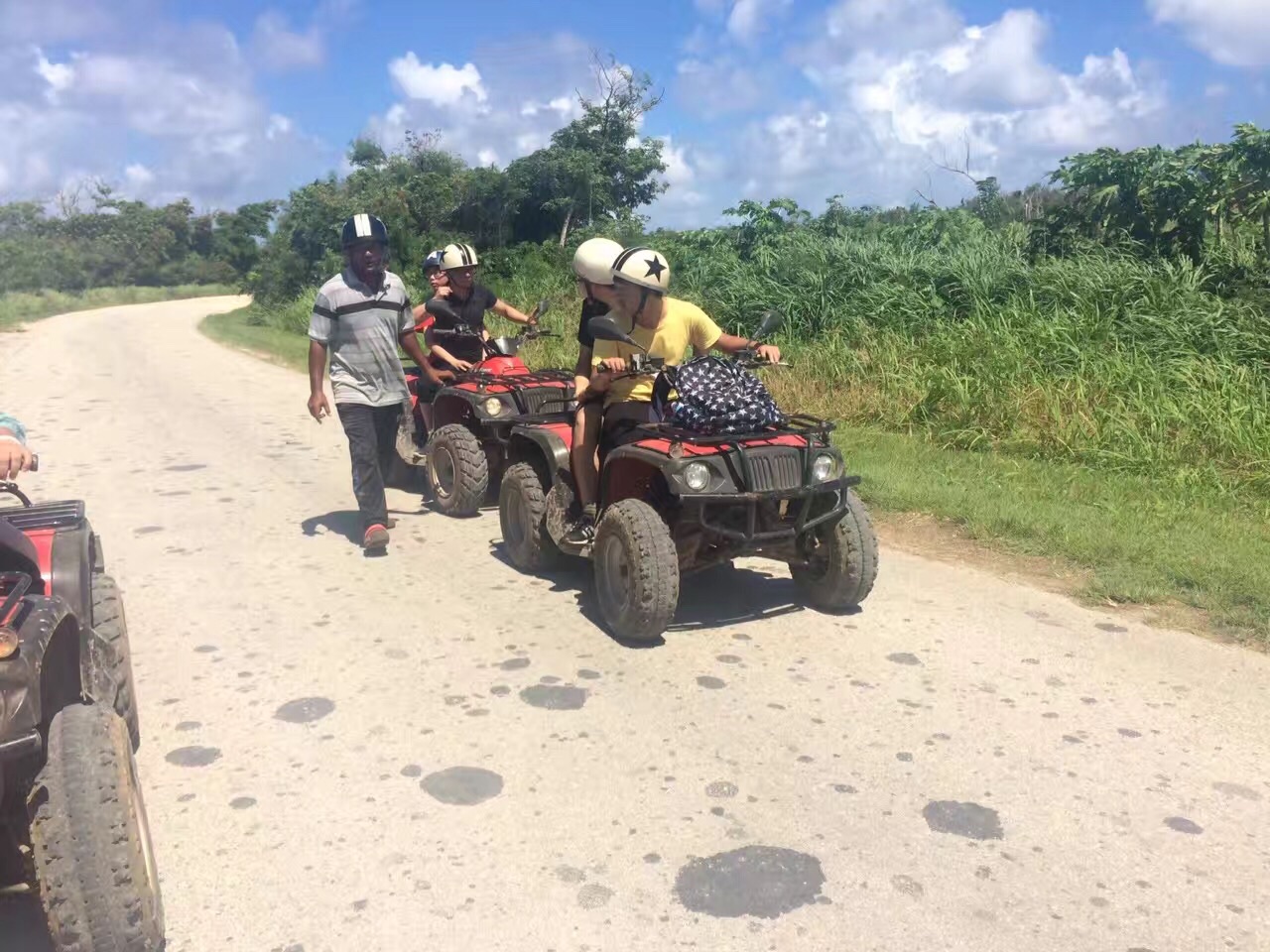 第四天在网上订的ATV越野摩托,预定日期前一天,地接会和你联系第二天的时间,所以放心玩,有地接会提醒你时间的,很贴心!一大早小周周导游就来接我和娃,路上捎带了其他客人一起,来到开摩托的地方,会有一个当地人来带着大家走,先要在一张表上面写下你的名字和房号,类似于安全告知书之内的,然后分发安全帽!在塞班,可以选择不同的路线,刺激的是最高峰那条线,但我有小朋友,主要以安全为主,就选了南部海滨路的丛林这条线,事实证明这条路也很不错,路面有平地也有一些拦路,很是刺激,一路风景也很好,中途会在两个海滩稍事停留,大家可以拍照玩耍下,其中有个拉德海滩,就是跑男录节目的海滩,海滩上面有个买纪念品的,那里可以买到装有星星沙的纪念品,基本上是全塞班最便宜的,三美刀一个,喜欢的可以入手哦!值得注意的是一定穿长衣长裤去开,因为会很晒哦!在丛林间穿行也很刺激,前面有一个当地的导游带着大家开,大家跟着他开就好,一开始可能不太熟练,过一分钟,我这个没有任何开车经验的菜鸟也能开的平稳驰骋起来啦!只是摩托的方向很重,比较难操作,但大家放轻松,很快你就会爱上它啦!中途教练也会关照大家,会主动帮忙,还帮我照了像,人很好,大家完全可以放心玩耍,全程大概一小时,但确实值得体验,真的超爽!开完后,我付了两美元小费,感谢导游!