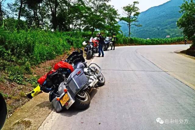 在离巫山市区几十公里处的切一个弯道时,我的轮胎失去了抓地力,咣当一声,连人带车沿着十几度的下坡往下滑。一瞬间,我感觉里整辆摩托车在我头顶象一架黑鹰直升机一样盘旋,保险杠、轮胎,尾箱、车把,有一二次,发动机撞上了我的头盔,接着又被保险杠撞了一下,秀逸头盔很好的保护着我,感觉这种撞击更像是一种拍打的提醒。除了摔倒片刻有点晕眩,整个过程我始终有着清醒的意识。