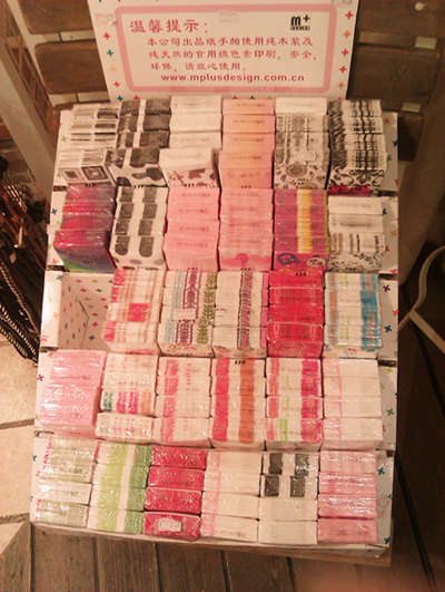很可爱的纸巾,各种各样的花纹。还写着安全、环保~应该买包回来纪念下的~哈哈。