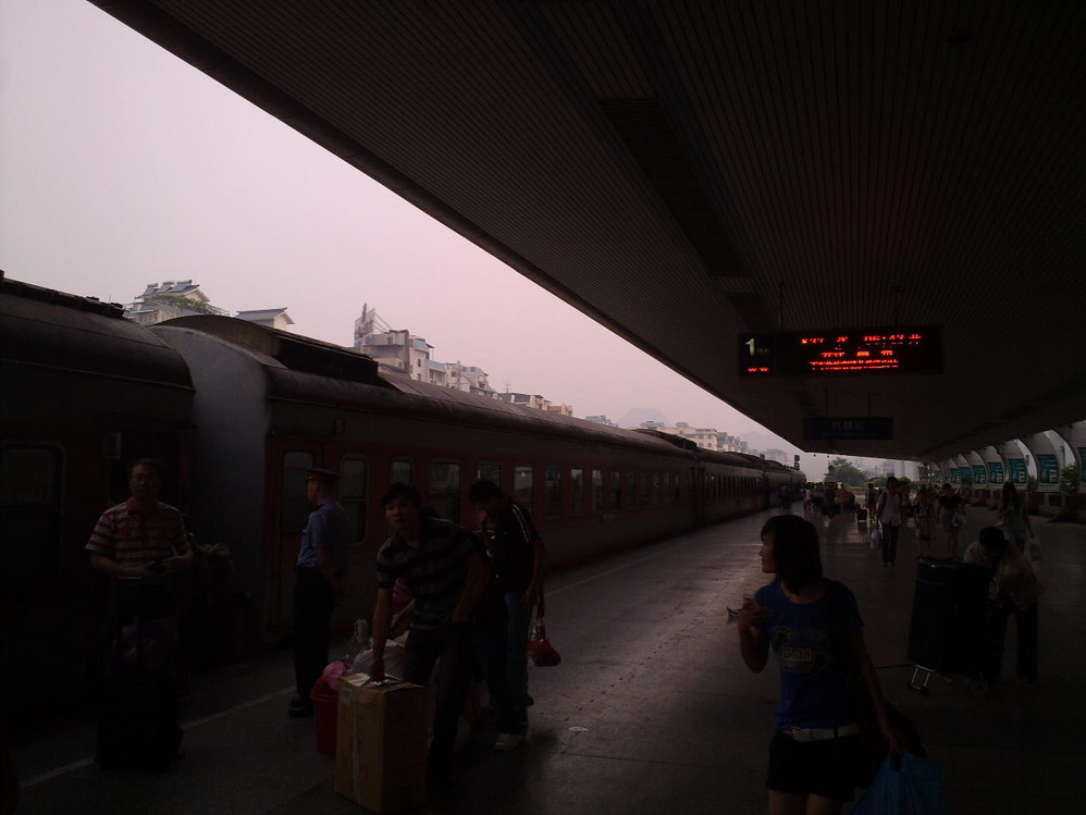 11号下午4时左右,广州天空乌云来袭,眼看快下雨了,我背起行囊提前出门赶去火车站。5点30左右到火车站,当时火车站前电子屏上显示去桂林的列车已开始入站检票了,于是匆匆忙忙挤进车站上了火车。