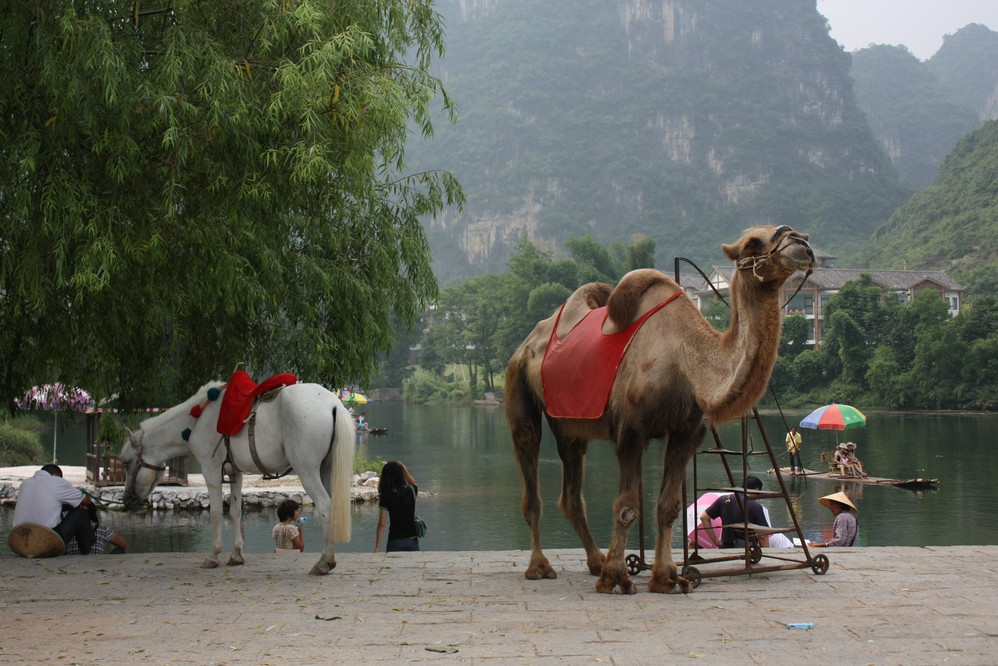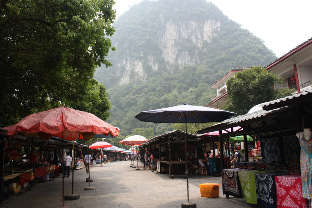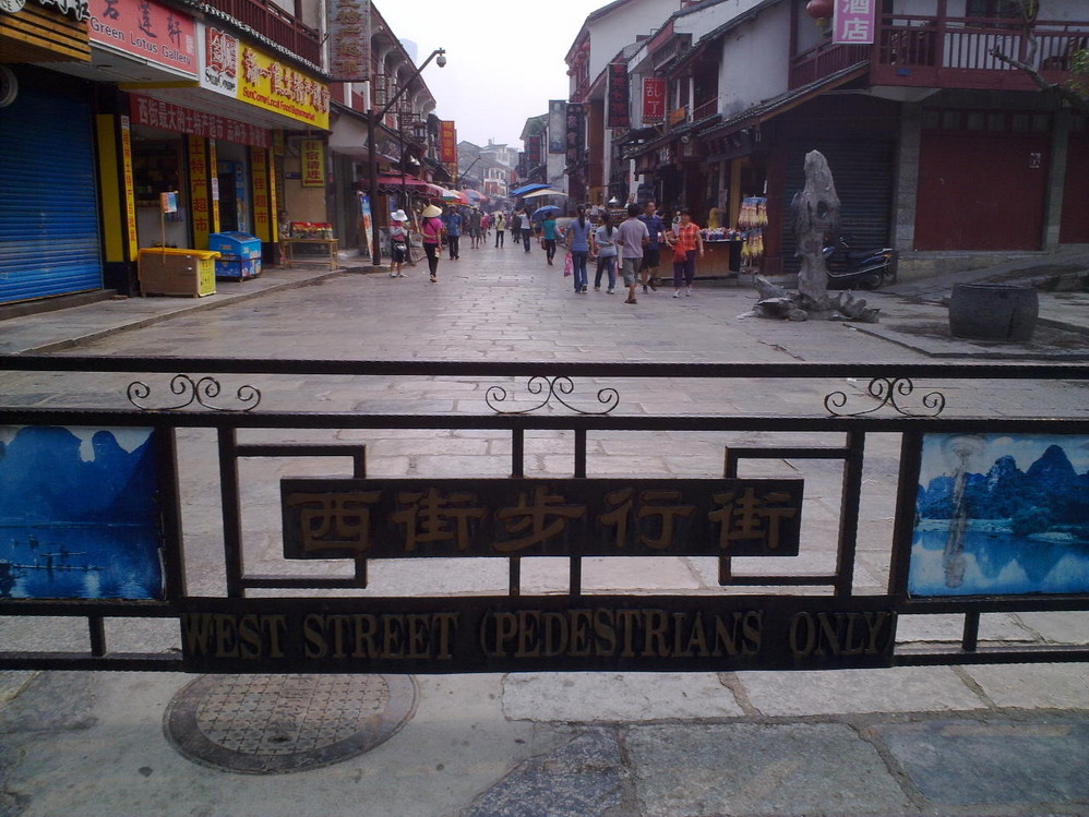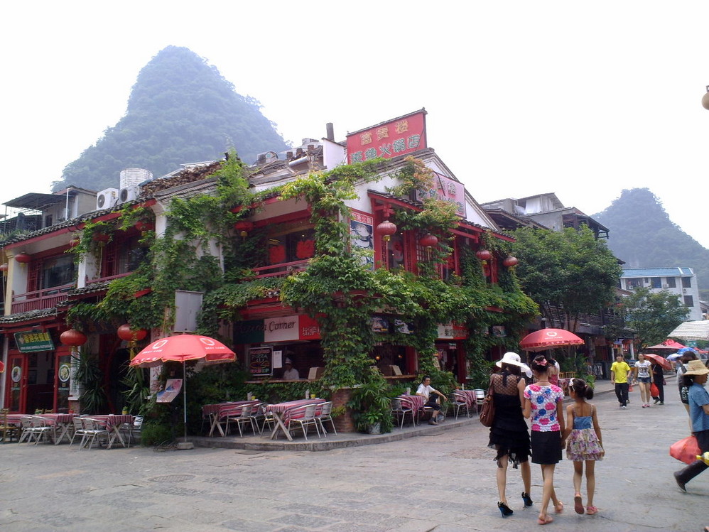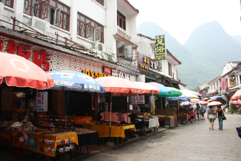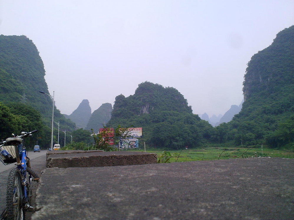 首先在旅舍门口一单车租赁处租了一辆山地车,老板开价20,聊了几句把价格砍到15(另外要提交100元押金,晚上7点前要归还)。骑着自行车先把整个阳朔县逛了一遍,也许是旅游旺季,街道上人多吵杂,感受不到阳朔原本的风味。