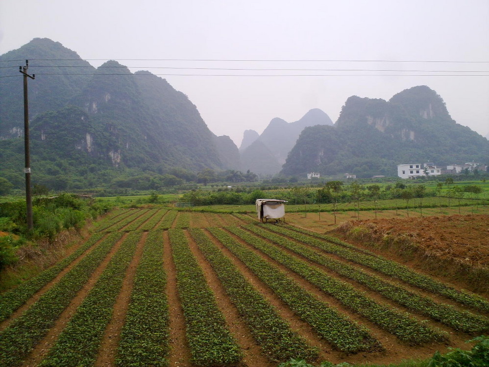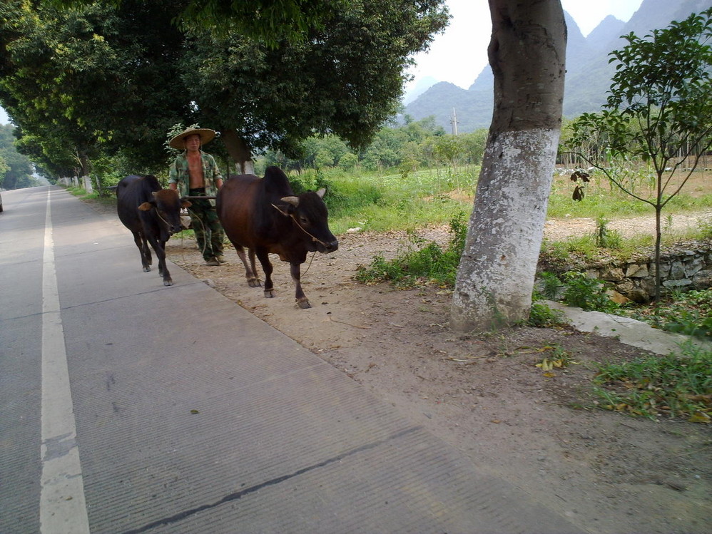 去阳朔路上,车窗外能看到的风景跟想象中有比较大的落差,不过依然能看到当地农户扛着锄头牵着水牛的原生态景象。