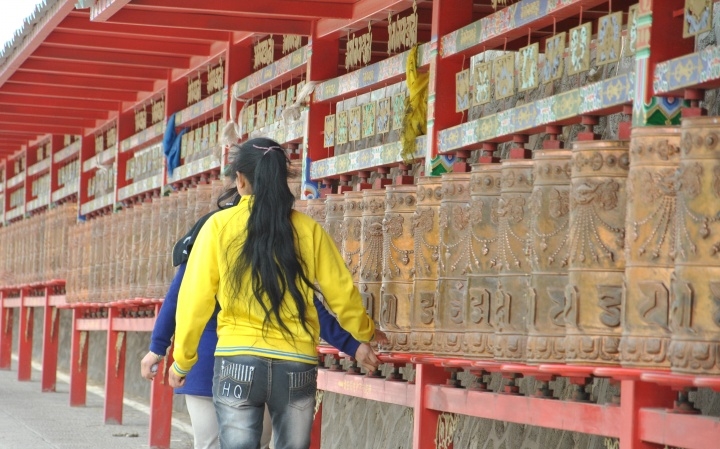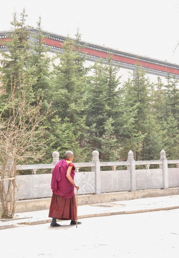 后来走到一个静悄悄的阁楼,木梯踩着摇摇欲坠,上面供奉的神被布遮着,觉得很诡异,赶快下去了。殿堂外磕长头的老年朝圣者不知从哪儿一路到这儿来的,身旁放着肮脏的行囊,磕累了就坐下来读经。据说每个虔诚的喇嘛教徒,一生要磕完十万个头,年轻时没时间,老了以后一定会完成。
