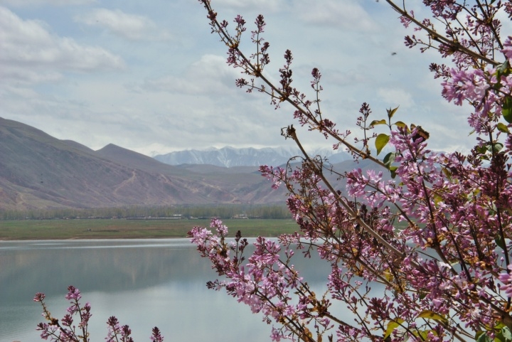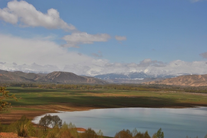 欢天喜地下了车,爬到对面的小山坡上远远看。噢麦雷滴嘎嘎!!!好蓝的天!用非主流的话就是近乎忧伤的蓝!!!用我的话说就是蓝得跟硫酸铜一样!洁白洁白的云朵大片大片移动。近处是一片绿色田野,田野上有一汪小湖泊倒映着蓝天白云。远处是重重叠叠的峰峦,投着云彩的影子。再远处就是祁连雪山,像白龙脊背一样若隐若现地蜿蜒着。土鳖的我想不到任何词可以形容当下的美景,只能发自肺腑地振臂高呼:死在这里也不错!!!