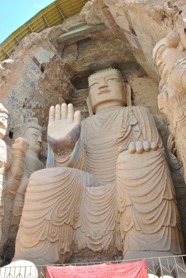 先在侧面适应了一下二十米的金刚和普贤的高度,再慢慢蹭到中间仰视三十多米高的释迦牟尼像。我一手拽别人袖子,一手死死握着身后的护栏,心中默念我不怕我不怕。工作人员说,你还不错,有的游客刚走上栈道就回去了,看都没敢看一眼。原来有病的不止我自己,但我是勇敢迈出去的那个!鼓掌!!!谢谢。