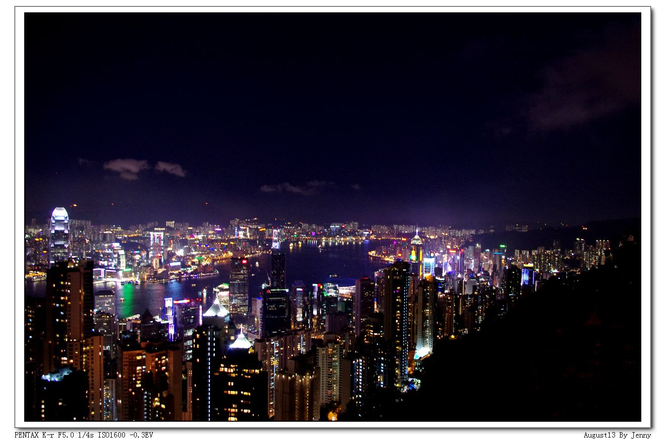 搭车上太平山顶,道路曲折,司机保持在65码,娴熟得很.日期并未到月半,但是月亮已圆,在清蓝的天空里显得十分明亮.山顶空气清新,凉风习习,我想起亦舒的主人公在半夜驾车盘旋上山,或有豪宅或有公寓.无数人在拍摄维多利亚港夜景,我也调了半日相机,拍了许多美妙的夜香港.