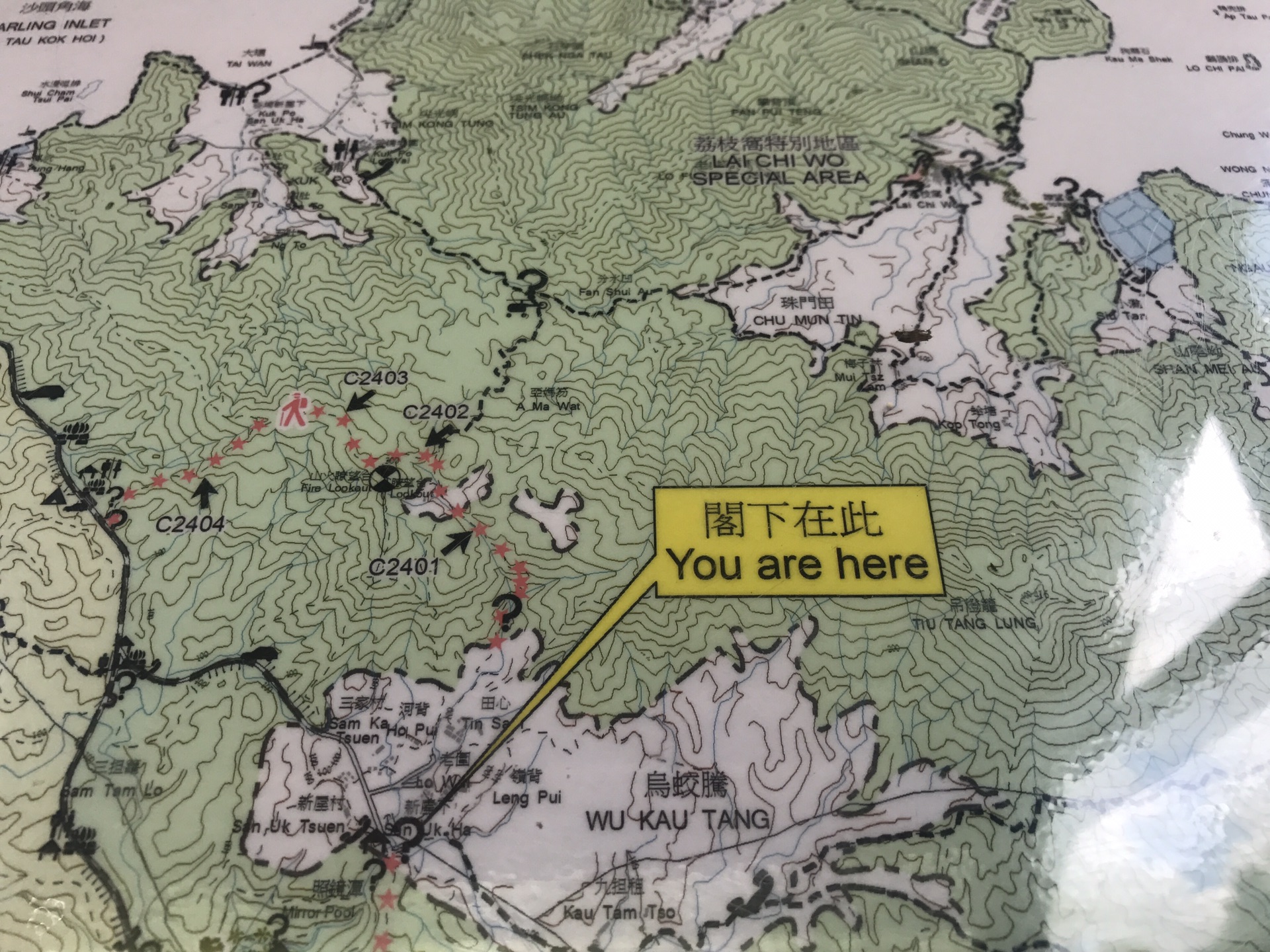 往上走,看到指示牌,乌蛟腾在指示牌右手边进去岔路,进去可以看到郊野公园路线。直走进去过了公车站亭,再走进去,左手边有个指路牌小路,沿着 乌蛟腾公厕后面直接往里面走,就直接进入徒步道。。。