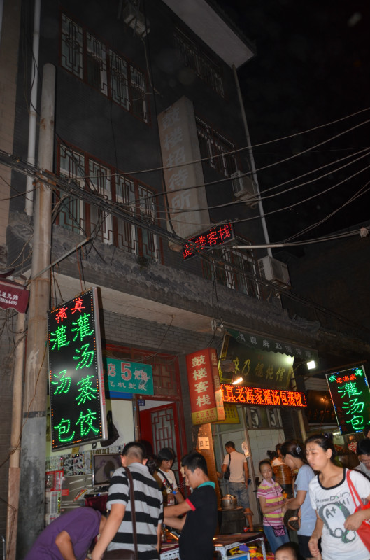 车到了汽车西站,下车第一感觉是——太热了!!就像有无数个火盆围绕着自己,那个热浪啊!难受啊!一下车就有一个三十多岁的瘦高个儿操着关中话问我们票有没有用,没用给他。有点奇怪,有点警惕!朋友说可能是要报销。管他呢,不理他!我们的票要留作纪念的。不可以让他钻国家政策的空子啊!西安给我的感觉总是这样——楼高、人多、车多!在车站对面的公交站等到一辆公交,来到鼓楼站。找到朋友提前订好的鼓楼客栈。