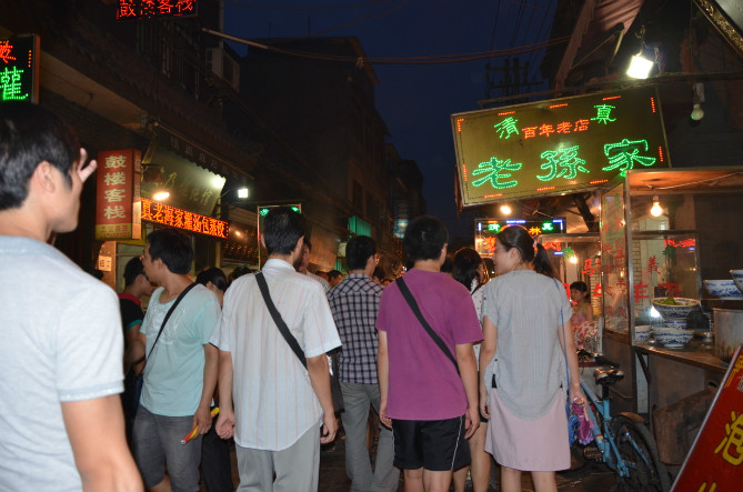 到对面的店里看见卖各色丝绸。挑了一条蓝白碎花的丝巾,跟我要去的高原蓝天白云想当契合。店里跟街道上一个样随处可见的老外——金发碧眼、人高马大的欧美人;黑发大眼、卷曲浓密的长睫毛的阿拉伯人......这些都让人感觉到我们身处西安这样的国际大都市的旅游特色街。唯一不足的就是这样的市井古街有点脏,有点给中国人丢脸。但或许到境外也会遇到这样的街道吧?!或许境外的月亮不一定比中国的亮吧?今生如若有机会一定要去看看的。