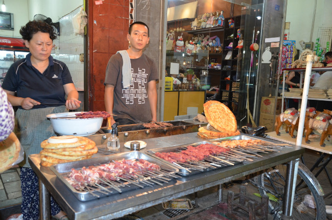 好吧时间还早就去坐公交吧。看路边有烤面筋的。这可是儿子爱吃的,所以就给他钱买了两串。儿子让我先尝尝,尝了一口味道一般般嘛。坐上车回到鼓楼那条小吃街。在一家叫迪尼餐厅的清真饭店吃了炒米饭和炒面、儿子还吃了爱吃的羊肉串。羊肉串不便宜啊!5元一串,上面也就5个拇指肚大的羊肉丁。其他家还有10元一串的。不过味道还算行。店里有个小二可能是店主的儿子,约莫十一二岁,跟儿子差不多吧?他的左手上缠着厚厚的绷带。就算如此他还要干活——捡碗、擦桌子。还算是个懂事的小孩子!我悄悄跟儿子说:“你看他手都受伤了还要干活真不容易啊!”儿子只顾点头。不过儿子也算是挺懂事的每次有好吃的总是先让我和老公尝尝。看他一天天长大虽然有时候会觉得有一些不尽人意的地方,比如:做事拖沓,但每当他很懂事的时候,我们还是很欣慰的!其实他没有让我们操多少心,不管是学习上还是生活上,或者是身体上。这是我们夫妻最值得庆幸的事了!或许是上天怜悯我们这些白手起家的穷人吧!