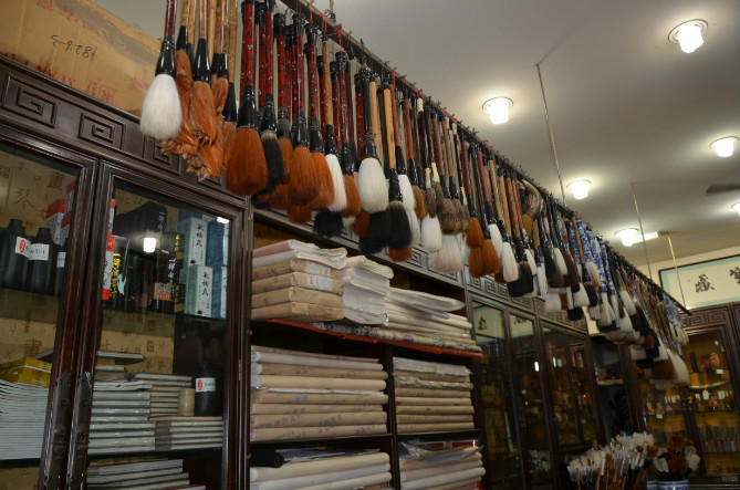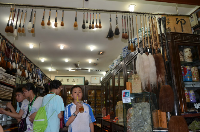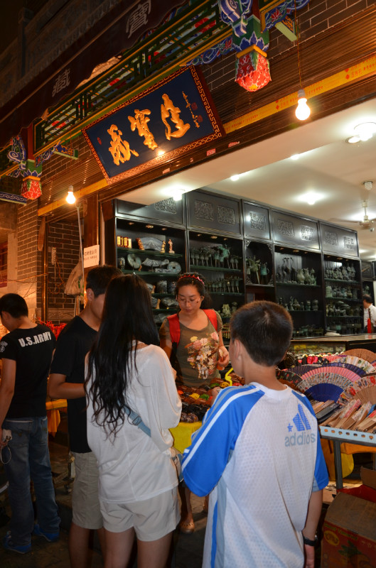 吃过晚饭,我带着儿子在西羊市夜市逛逛,街上可以说是人头攒动,小吃、工艺品、土特产应有尽有。儿子发现了古代流传下来的乐器——埙,还有木质的癞蛤蟆。挺有趣的,就给他花8元买了一个埙。用小木棒一拨就会发出蛤蟆叫声的癞蛤蟆有点贵,拳头大小的最低也要20元,儿子也觉得贵,就忍痛割爱了,没有买。一会儿下起了雨,我们只好在路边的毛笔店里参观加上躲雨。看到了价格不等的小如细香签,大若拖把的各色毛笔还有其他的文房四宝,一应俱全。