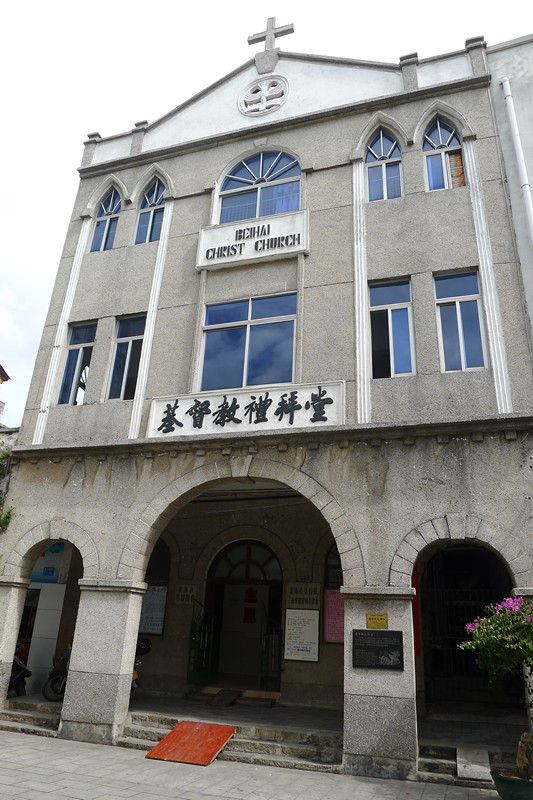 不知道是因为台风的原因还是别的,从老街 往回走的时候天空就突然变了脸,黑压压的乌云气势磅礴地向着老街 涌来,一场大雨在出了老街 后如约而至,我们俩继续向着下一个目的地出发(在地图上看到的原英国 领事馆),结果当我们俩冒着倾盆大雨到达后才发现原来早已变成了北海 一中的办公楼,只能在栏杆外望楼心叹。原计划晚上去长青美食街吃晚饭的也因为这场大雨而泡汤。晚上看新闻才知道原来是台风发威,去岛上的船都因此停航了,而且打电话给岛上的旅店老板也被告知不确定明天能否按原计划上岛,两个人的心一晚上都悬着,甚至于开始做Plan B的计划。