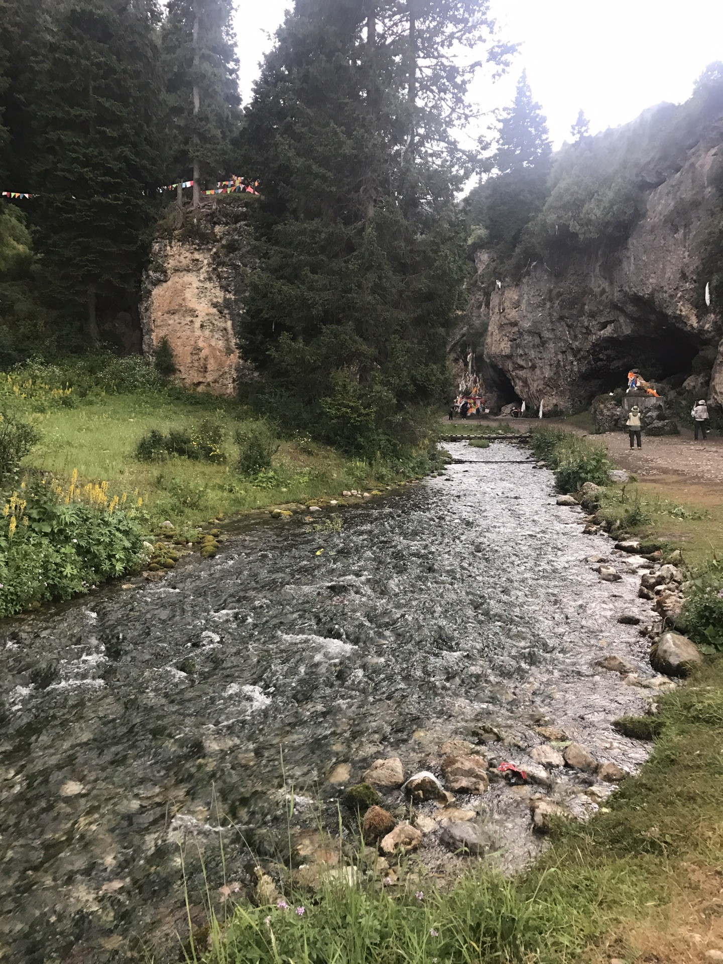 一条宽不足2m的小溪从镇中流过,却有一个很气派的名字"白龙江",如按藏文意译作"白水河"。清澈见底的白龙江水把小镇一分为二。江北是赛赤寺属于甘肃碌曲县,又叫"安多达仓郎木赛赤寺",江南是格尔底寺属于四川若尔盖县,又叫"安多达仓郎木格尔底寺",均属藏传佛教格鲁派寺庙。一条小溪分界又联结了两个省份,融合了藏、回两个和平共处的民族;喇嘛寺院、清真寺各据一方地存在着;晒大佛,做礼拜,小溪两边的人们各自用不同的方式传达着对信仰的执著。