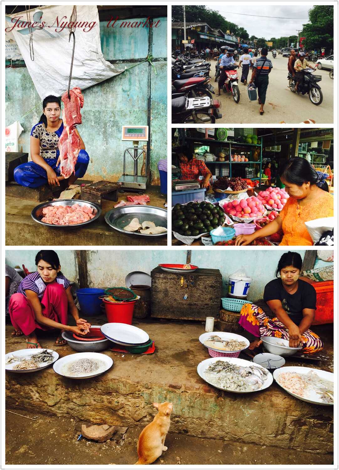 再度出发,俩人租了一辆电动车,伙伴是司机,将车开得风驰电掣,耳旁风声呼啸,竟有在辽阔草原上策马奔腾的错觉。今日要探险之地是良乌市场、瑞禧宫、悉隆敏罗寺。怕问路时当地人听不懂英文,我特意将目的地照片存在手机里,饶是周转数人,最好玩一次问路是在路旁的小吃店里,一个喝着奶茶大伯掏出华为手机用GPS为我们导航。次日恰逢昂山将军遇难纪念日,偶遇一个盛大机会,我们匆匆一瞥离去,终于在一个尘土飞扬之地找到了良乌市场。市场门口有大妈收停车费,一辆电瓶车100K,这个市场大家可以自行脑补农村集市,在异味严萦绕间淡定卖鱼售肉的摊主,是东南亚各集市间的别致一景。