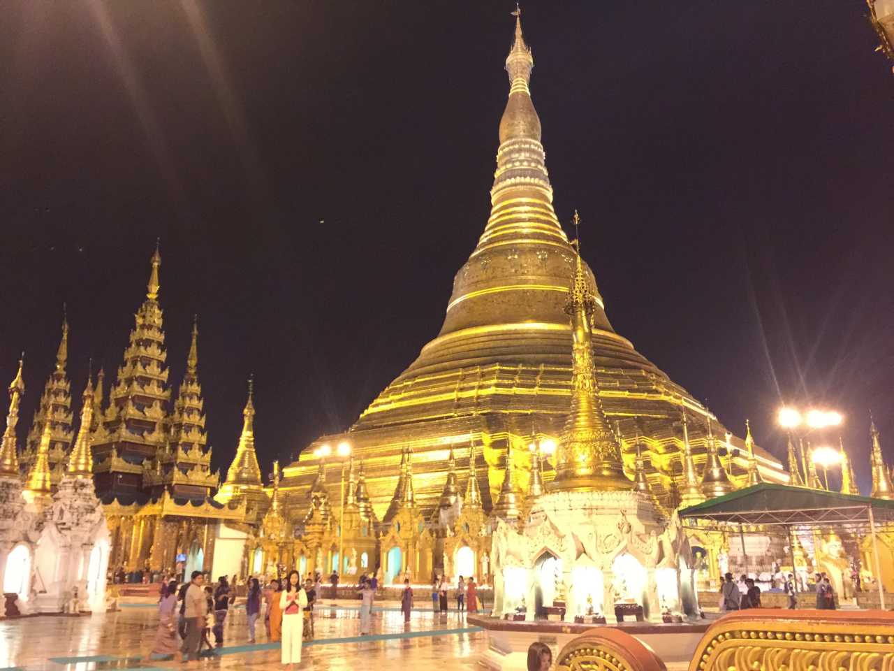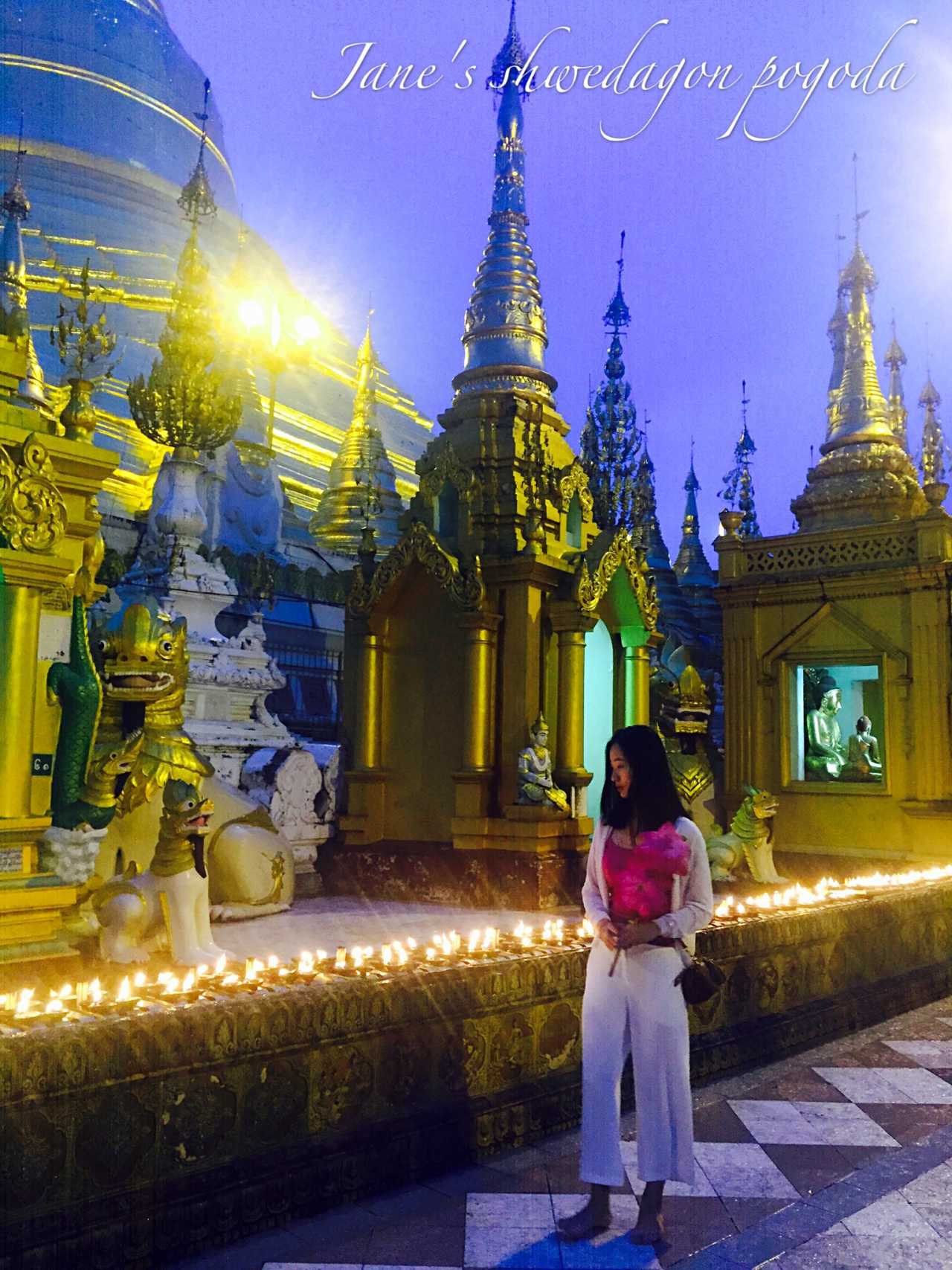 正当我们绕着金塔第二周时,有一个华侨老爷爷前来搭讪,说着简单的中文后知道我们会说英文立即转为英文。爷爷指点我们寻找大金塔尖的宝石,脑海中顿时“嗡”的一声,该不是现在读过的游记中提到的神奇爷爷吧!奇妙的很,只有站在爷爷的角度,不能偏差毫厘,才能看到那颗宝石璀璨的光线,好像天降奇兵似的。爷爷带着我们一路讲解,一路找最好角度拍照,我找到了自己的缅甸属相是星期五的天竺鼠,并在爷爷的指导下浇沐、献花,据说一切都会变得顺顺利利。在付了每人20000K费用后,我们愉快地和爷爷道了别,说来也是奇怪,回头再去找宝石时候怎么都找不到踪影了。