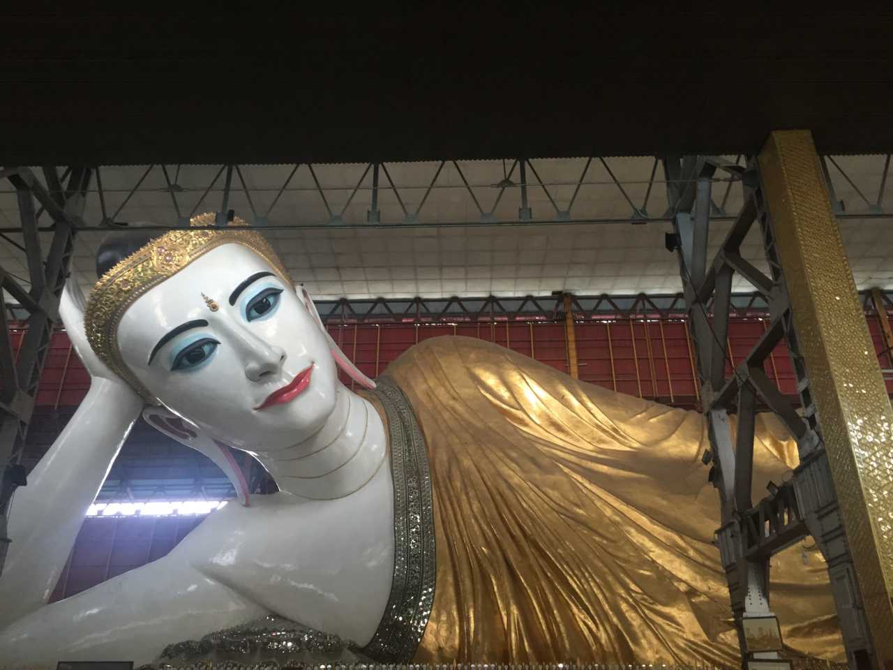 然后我们在突然而至的滂沱大雨中,徒步一天,询问无数路人,终于找到了书中提到的chauck htat Gyee Paya乔塔基卧佛,也偶遇了书中并未提及的一个大型寺庙。在附近的cafe20吃完两碗神似中餐的炒面后,心满意足地走回酒店等待出租车带我们去车站。