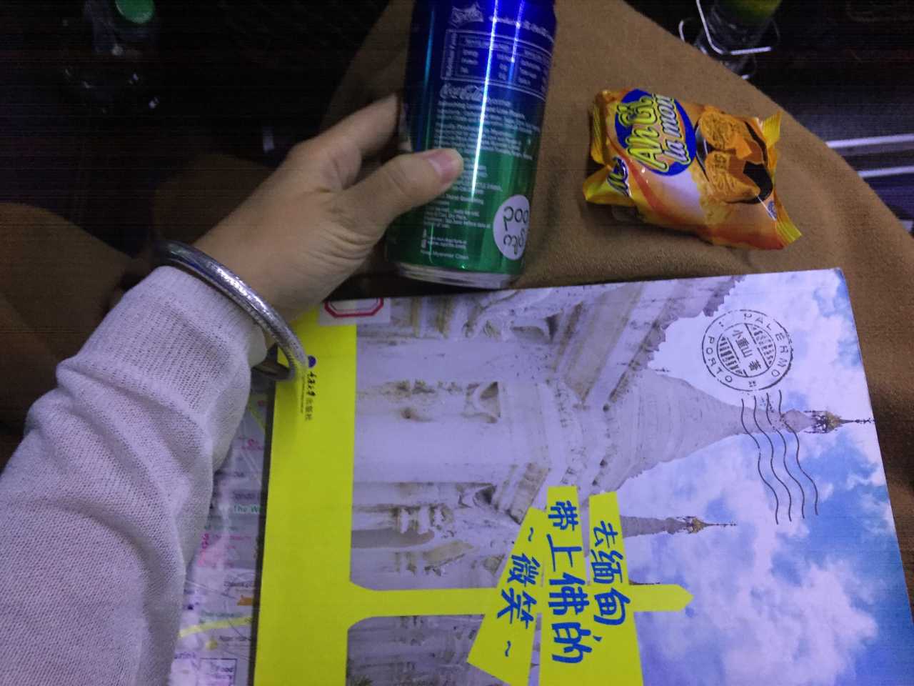 酒店大厅已有三个智利背包客,一个在十几个国家工作过的德国老爷爷和他的泰国夫人在等待taxi。他们与我们一起搭乘过夜大巴前往蒲甘,本来以为是同班车,还互道see u later,后来发现并不在一班车上。重点是,搭上出租车后倾盆大雨倒了下来,司机超快速穿梭在马路上,眼睁睁看着车外从城镇的热闹到乡村的静寂,我的心不免七上八下,就怕被卖在缅甸的乡村(出发前看了一篇关于奴率贩卖的微信)。一个小时,出租车总算停在了一个超级大的巴士站,血盆大口的小哥帮我们拿了行李,换了行李牌,看到满车的金发碧眼,总算安心了。车上每人一听雪碧,一瓶睡,一床毛巾毯,一个枕头,还有一个月饼?没错,一个豆沙馅儿的月饼!想着明天一早就到蒲甘,内心无比地激动。