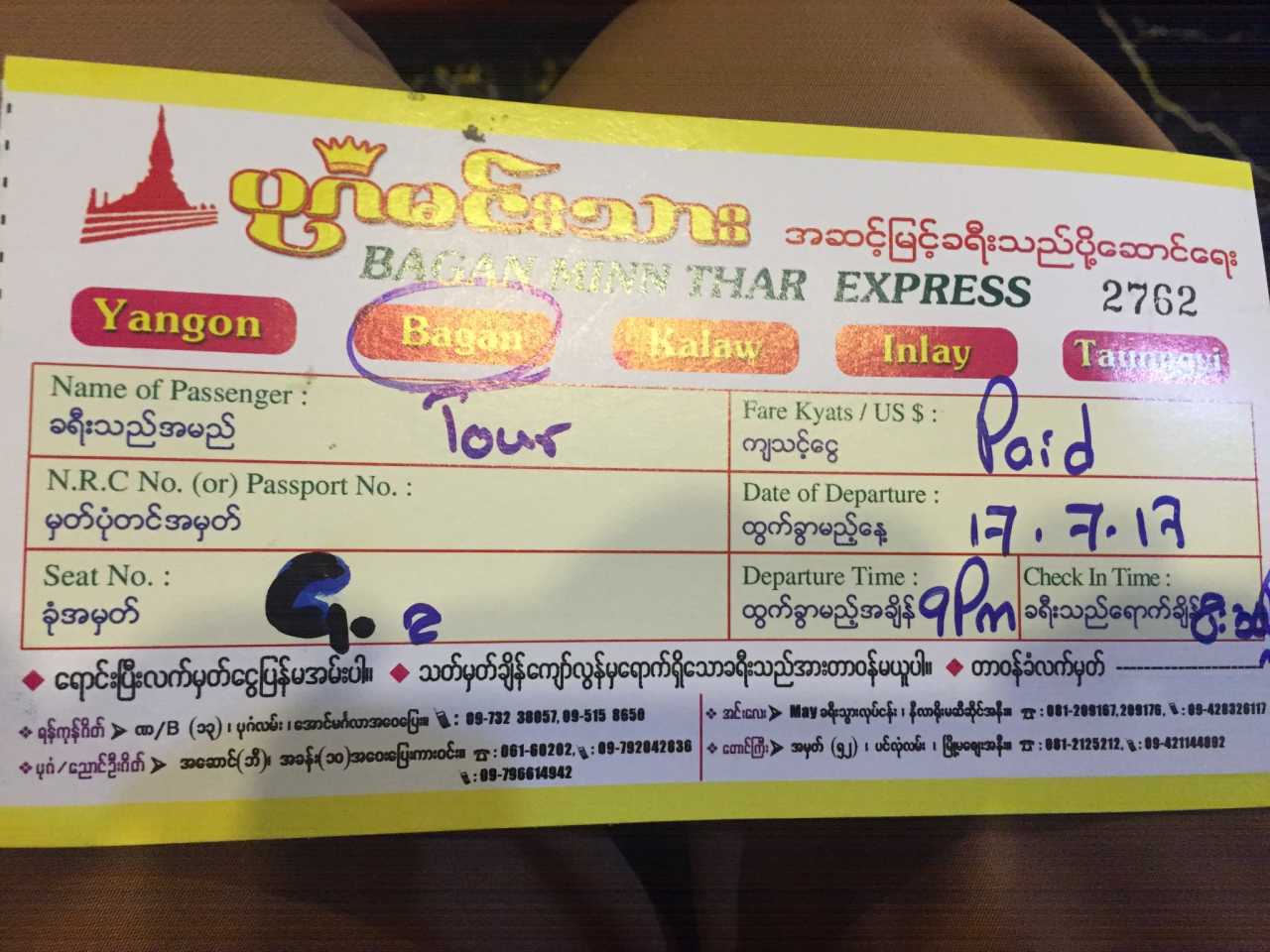 仰光到蒲甘过夜巴士20000K(18500K+1500K酒店代买费用)
