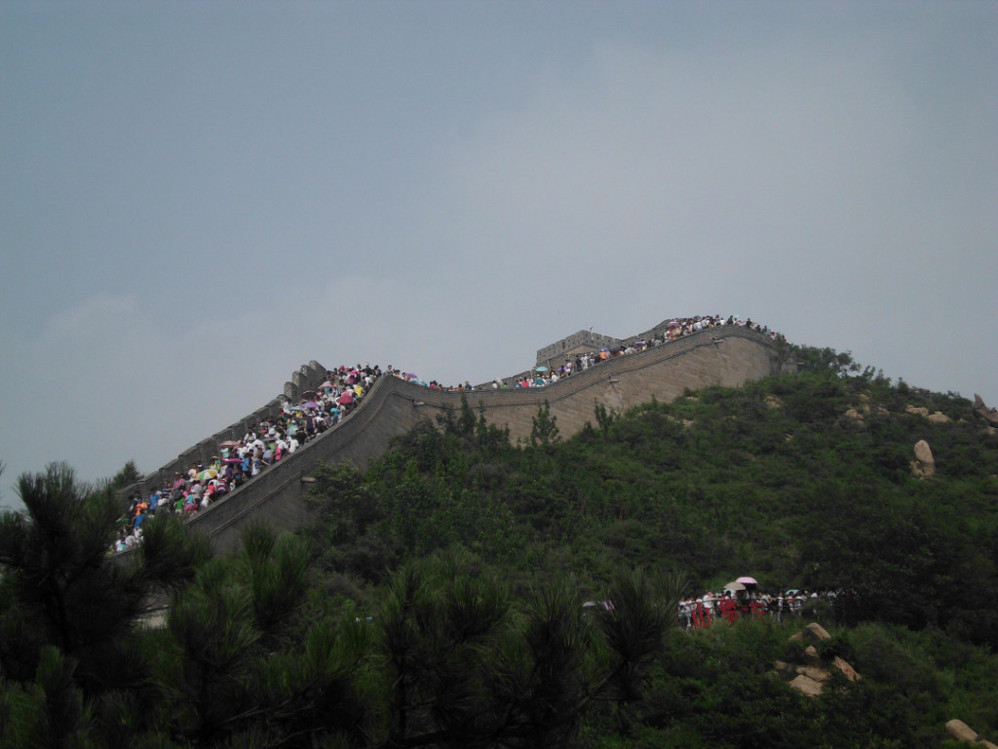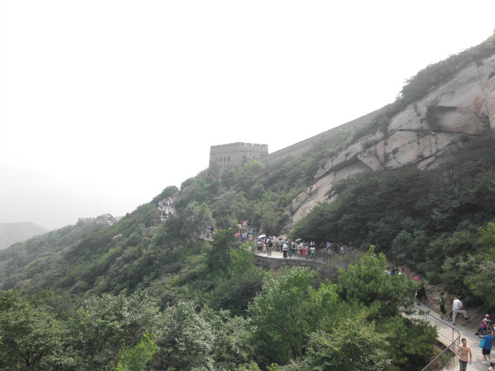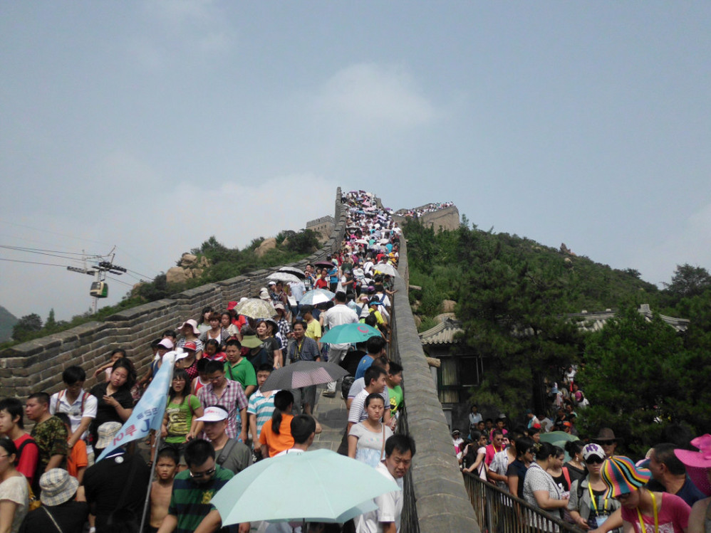 导游在路上开始忽悠我们,要坐缆车啊,天太热了,来了这儿就是为了到好汉坡啊,腿着上不去了哦,别省这个钱了。得,全车人都买了80块的往返票。不知导游能得多少提成,等缆车还排了半个多小时的队。后来在长城上问别人才知道,爬上去才半个多钟头。