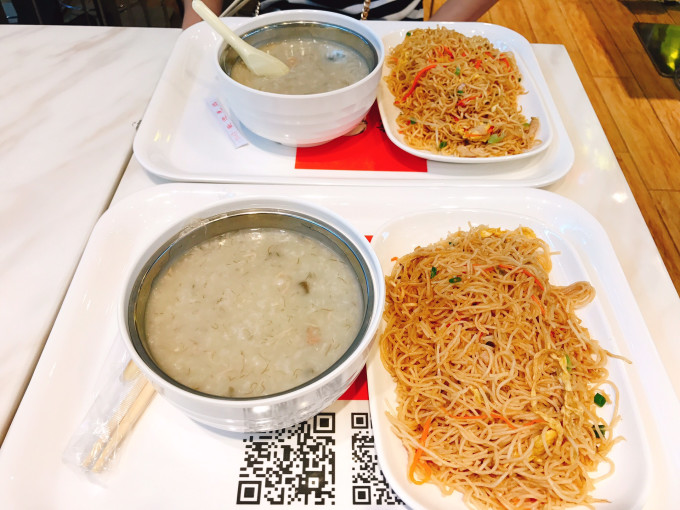 找了一家广式风格餐厅,每人来一份皮蛋瘦肉粥+炒米粉的套餐,味道嘛,填饱肚子足矣。
