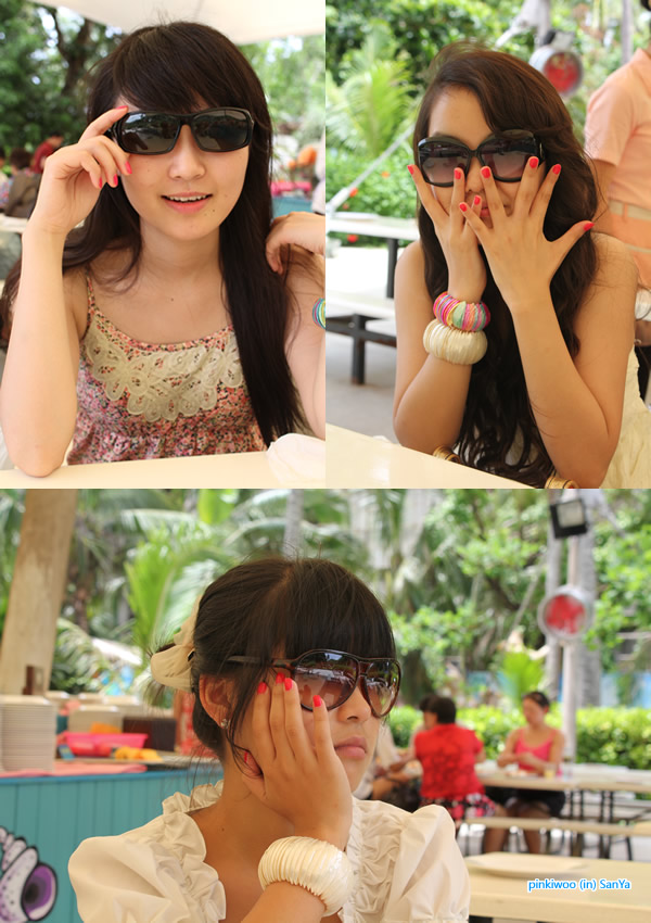 这张照片的意义在于晒一下黑超和指甲,海边肯定是要擦红色指甲油,越妖孽越好!