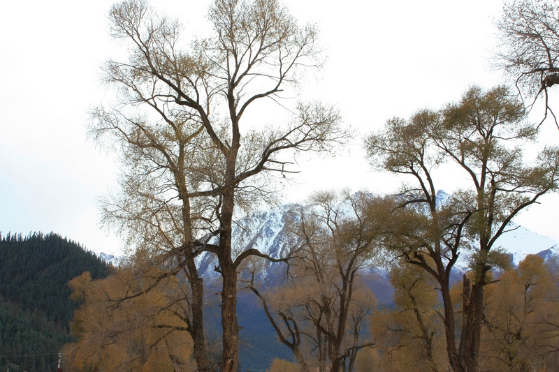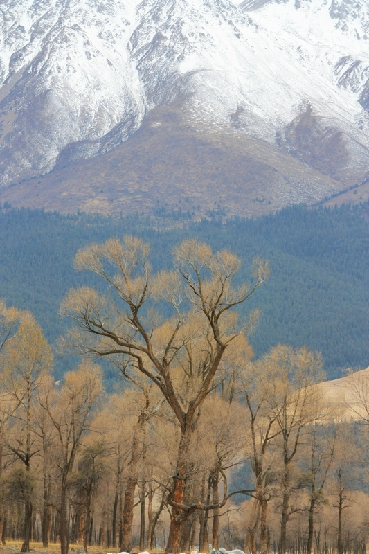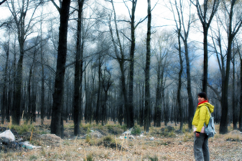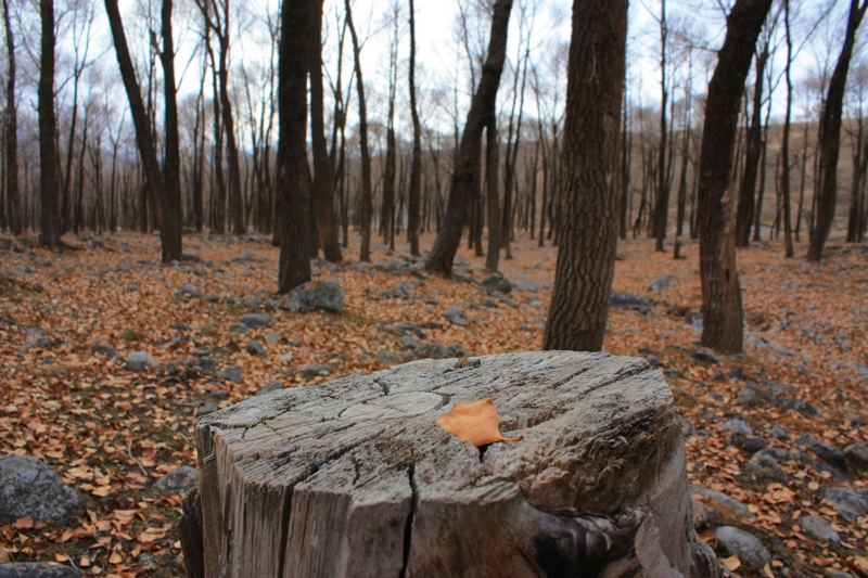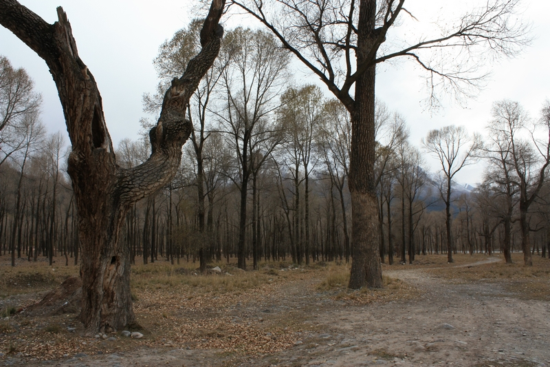 下去一看原来是一片河谷,水流很小,河谷里风很大,有片林子,树叶都落光了,剩下枝桠密密麻麻,很有意境。应该也是白杨树,村子那边向阳的地方有几棵还没有落叶,青青黄黄的叶子非常好看。