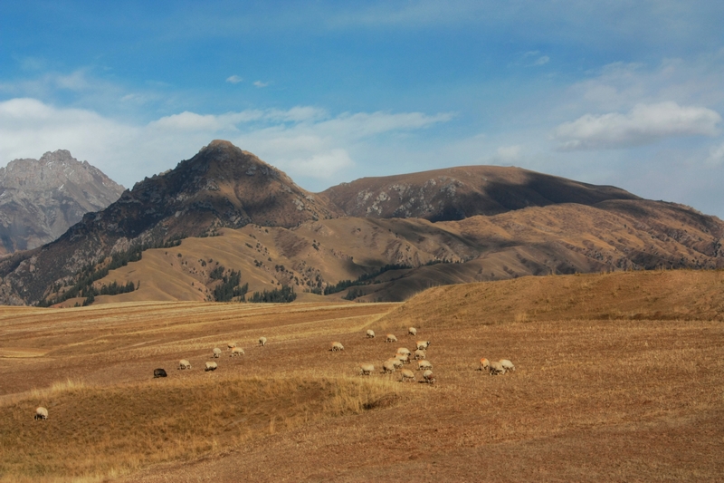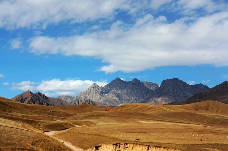 收割后的麦田,连着远处山坡山的牧场,被用来放羊,偌大一片,就我们两个人,偶尔会有羊群和牧羊人经过,喜欢热闹的人也许会感觉空落,可是相信我,起码在最初的那一刻,你的眼睛不会寂寞。去过川西 高原,也去过滇西北 高原,都和这里不一样。感觉这里即苍茫又多彩。