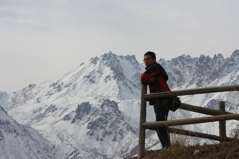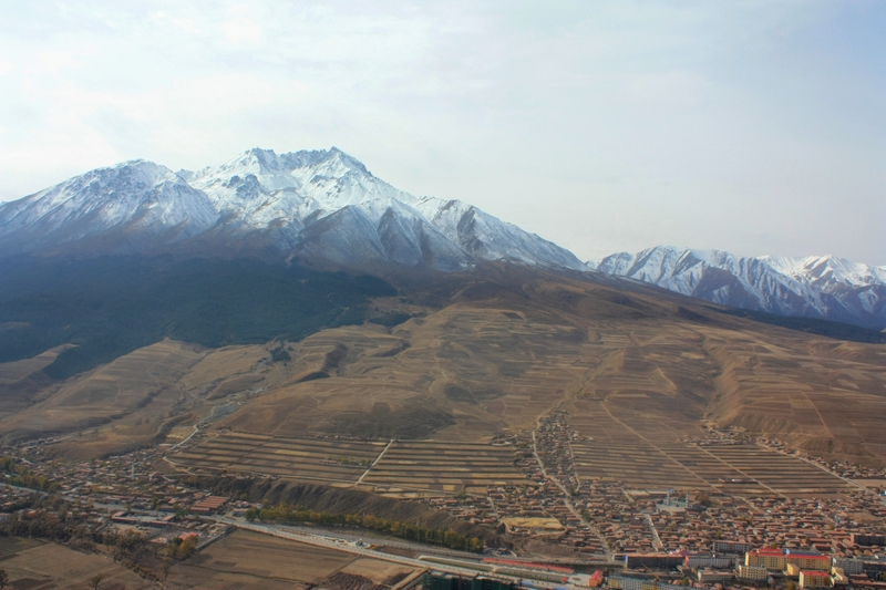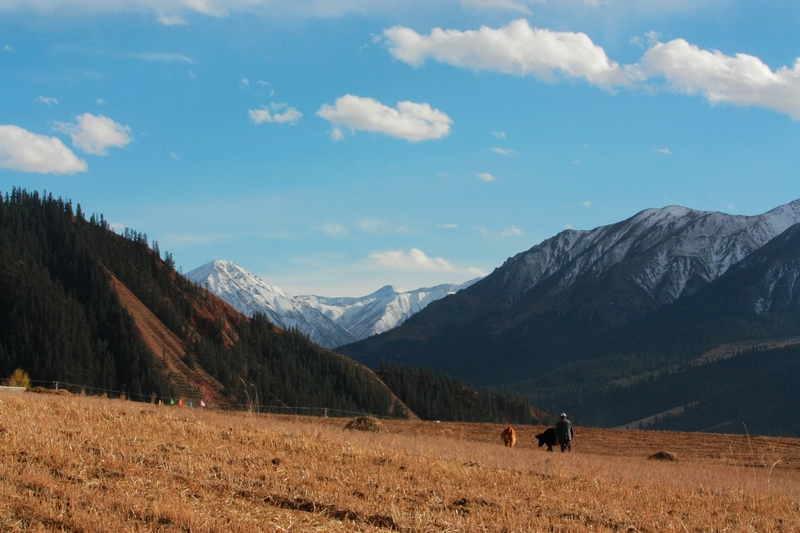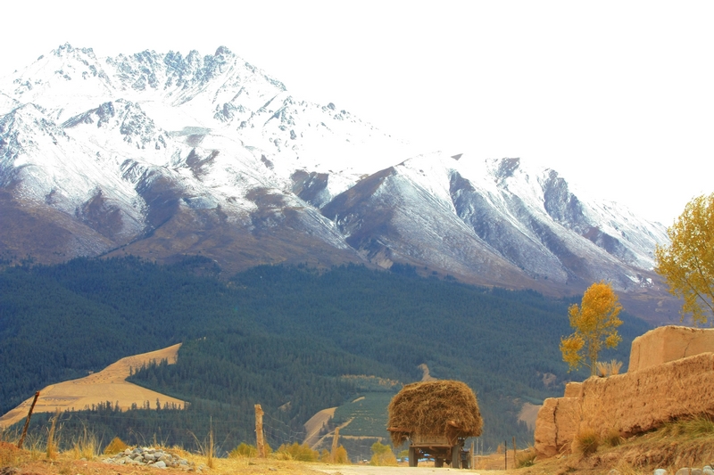 五个半小时后,到达祁连 县城,在一座雪山脚下,我们花15块打了辆车直奔卓儿山的田园农庄。