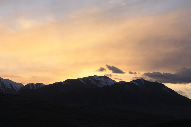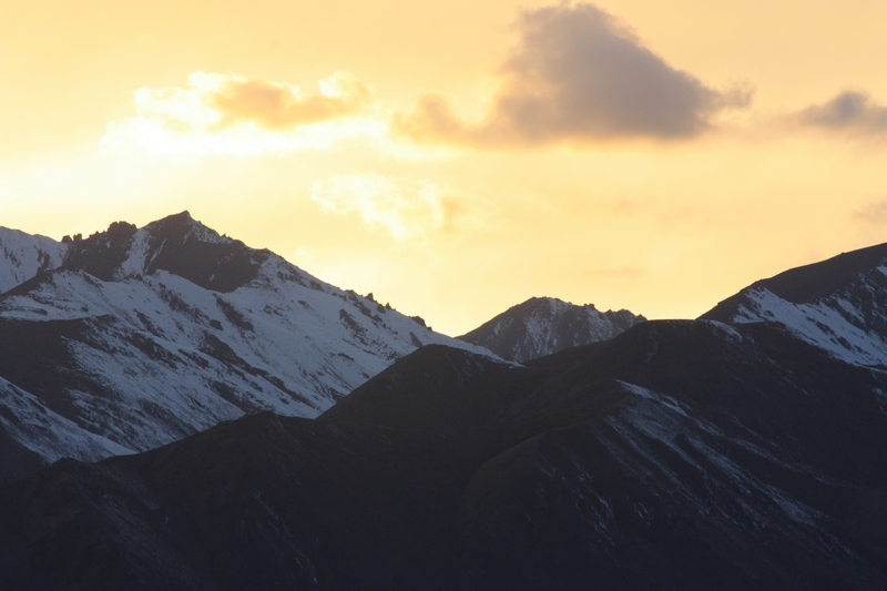 太阳下山的时候回到农庄, 这时夕阳西 下映照着雪山,通红通红,很美