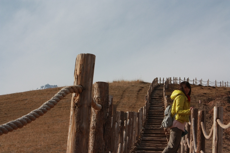 吃了早餐就上卓尔山 了。两边传说中的麦田已经都收割了,只剩下麦秆一点点露在田地。好可惜。看着不怎么高的山,爬起来也有些吃力,花了半个小时。收费处那里没人,看了一下牌子,10月6日以后就是淡季了,写着是半价30,但其实已经没人来收费了。上到卓尔山 最后有一段是铺了小石子垫了木头条,走得很累。山顶是个烽火台,很高,这个地方已经有海拔3000多米了。一边有丹霞地貌,一边能看到祁连 县陈,对面就是牛心山,就是那片雪山。回来的路上超了近路,从牧场穿过来,又赶了一回羊。
