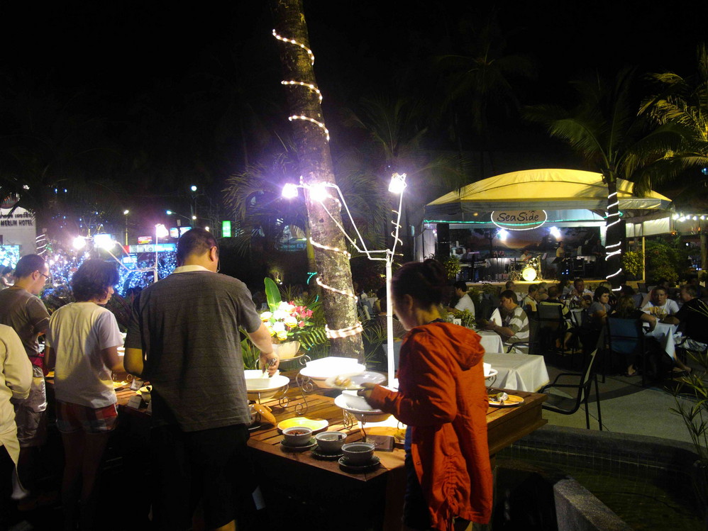 晚上拉到PATONG海滩边的BBQ海鲜烧烤大餐,那个场面相当好,海鲜种类少点,其他挺好,还有乐队表演。