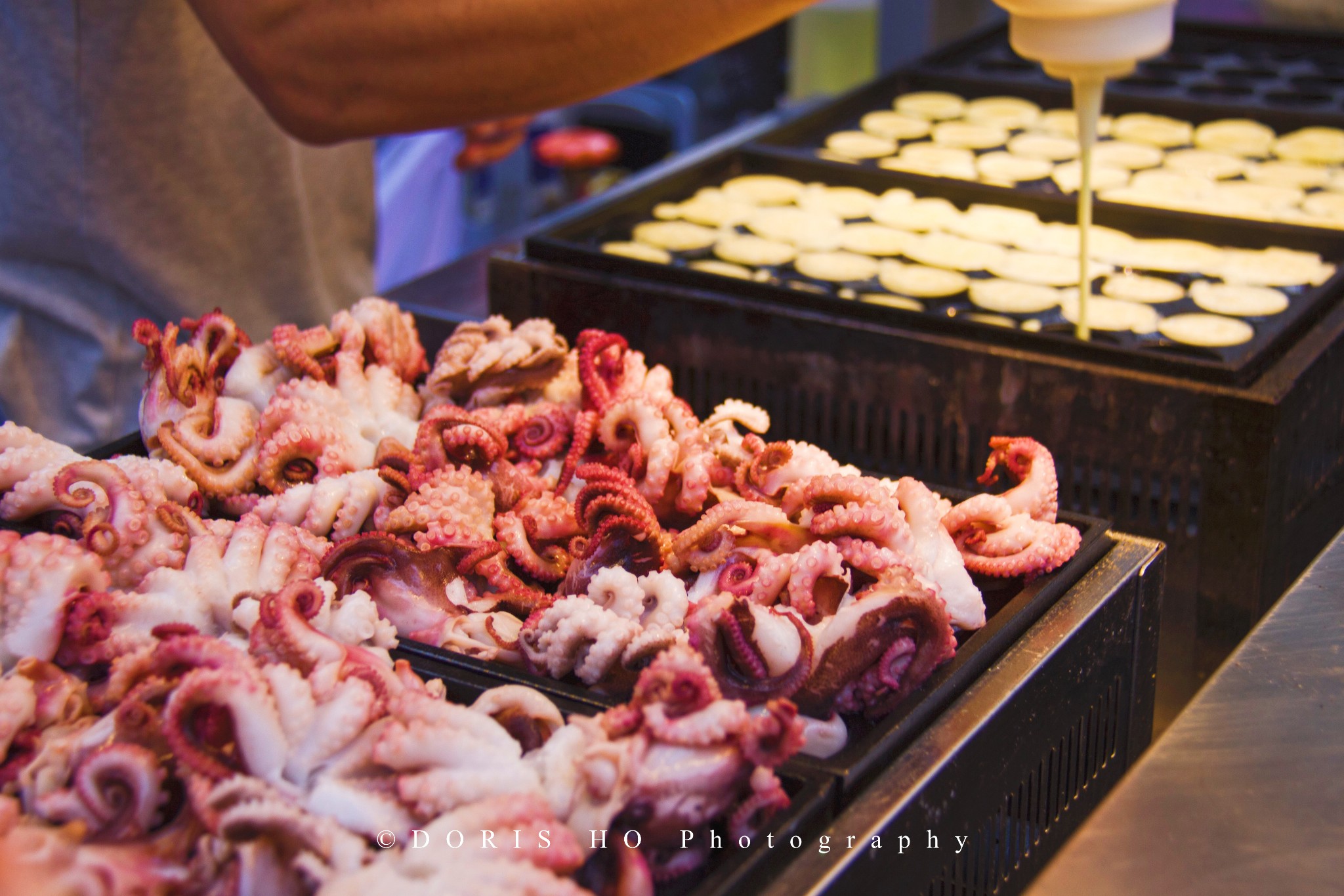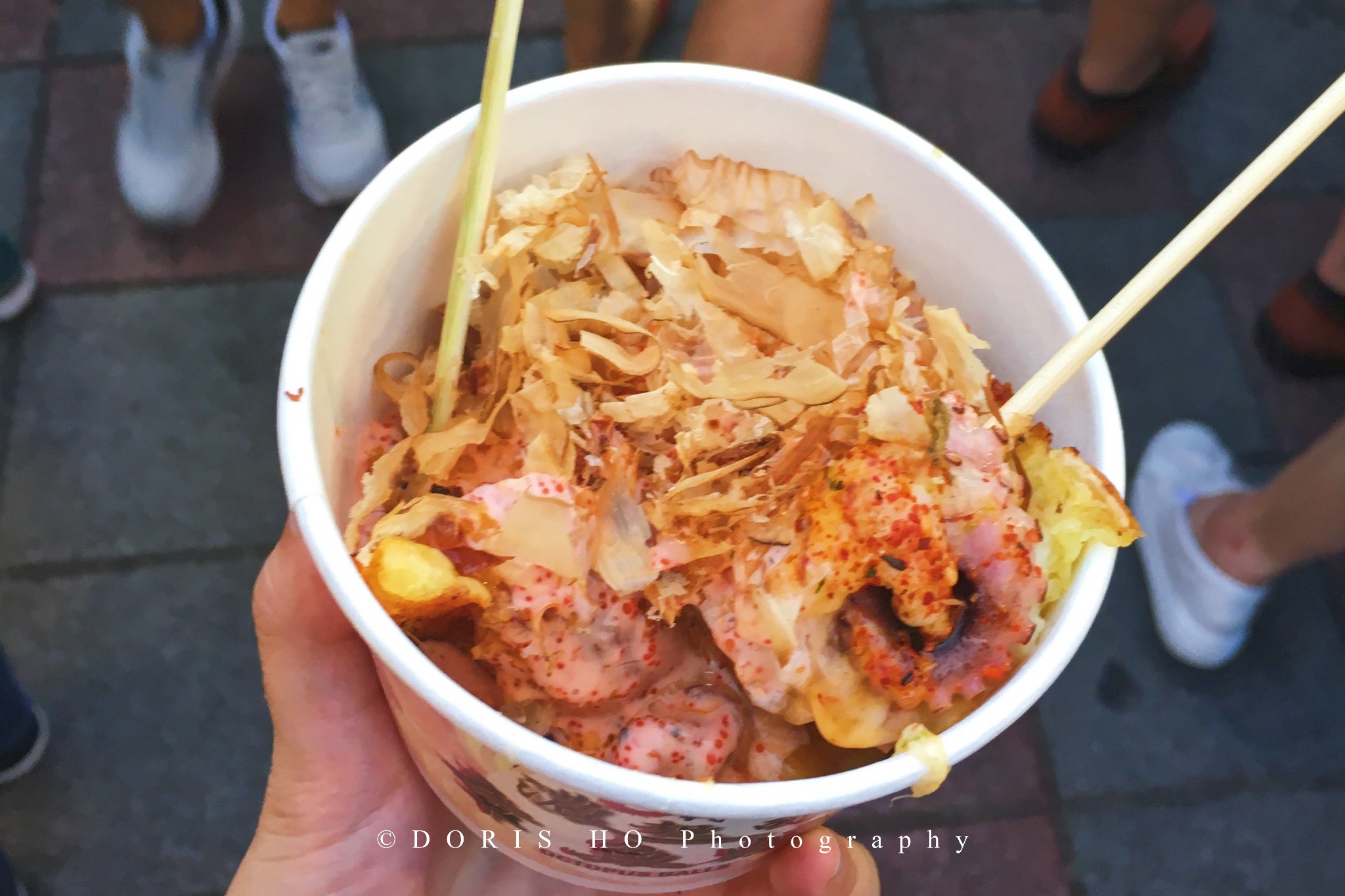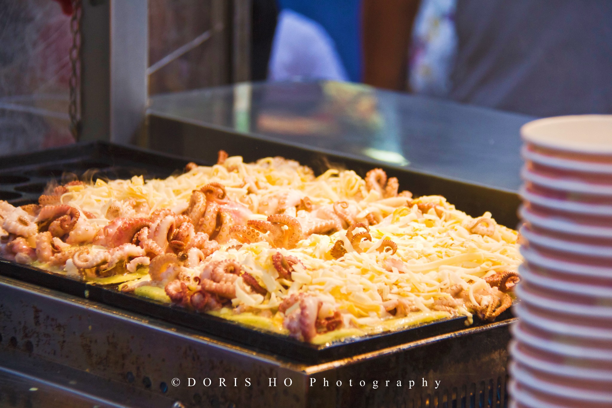 「这个章鱼烧超厉害!」表哥等了很久的浓起司章鱼烧终于开摊了,这款有整个大章鱼在里面,制作过程撒两次Cheese(量很多)再用火枪烧,一份有4大颗,可以自选酱汁。