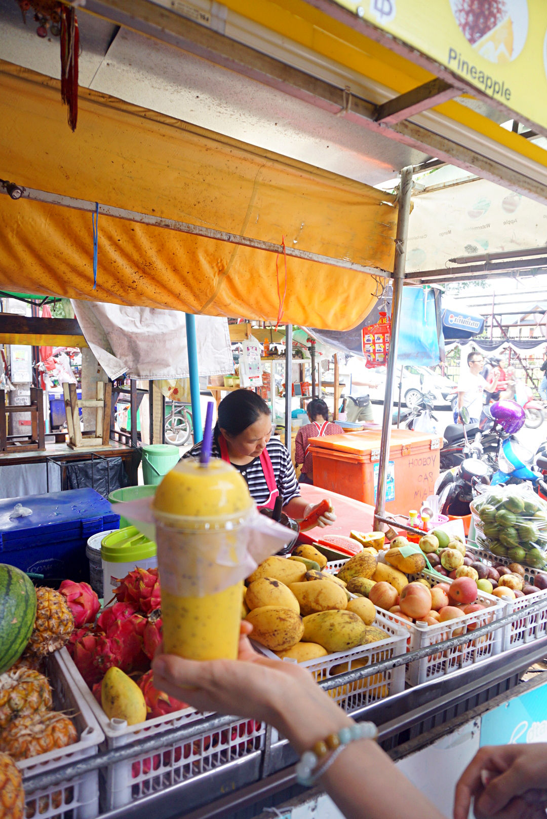 这个小摊在一所学校的附近,简直就是业界良心啊。两倍芒果百香果混合的果汁里有两个大芒果,7个百香果。之后在清迈的那些天都没有再遇到这么有内容的果汁了。