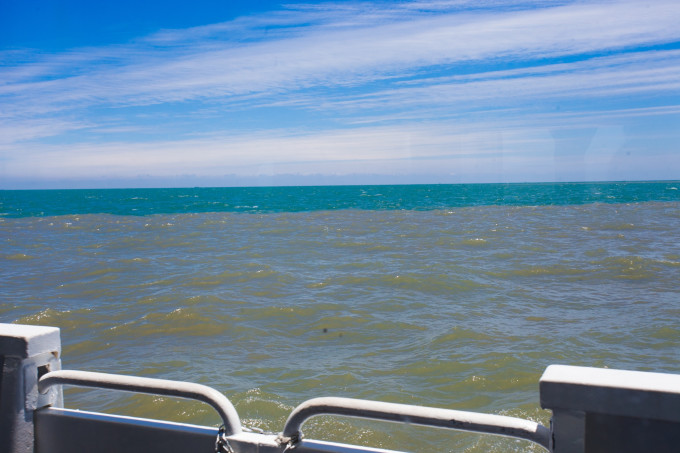 船大概航行了半小时以后吧,海的颜色就开始由黄变绿,再由绿变蓝。