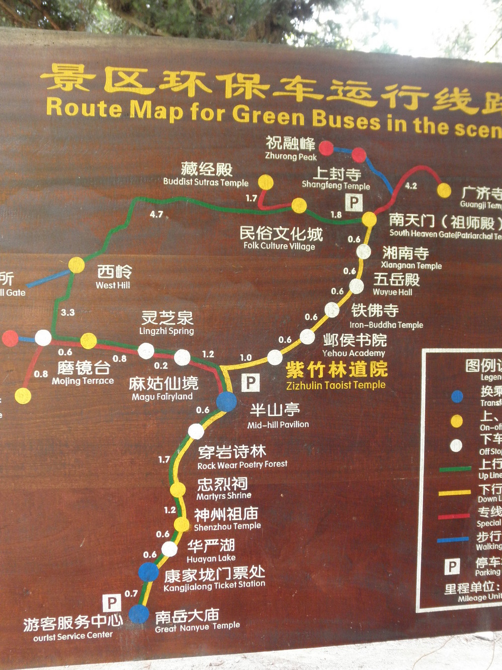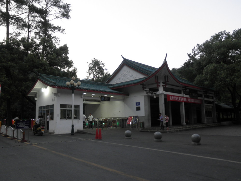 大概十五分钟后就到达了目的地,出了车站抬头就可以看见牌坊。牌坊后有免费的小游览观光车可以坐,可以到衡山 风景区进山处。过马路有1路车,也是免费的,同样也到进山处,只是停站点比游览车少些。