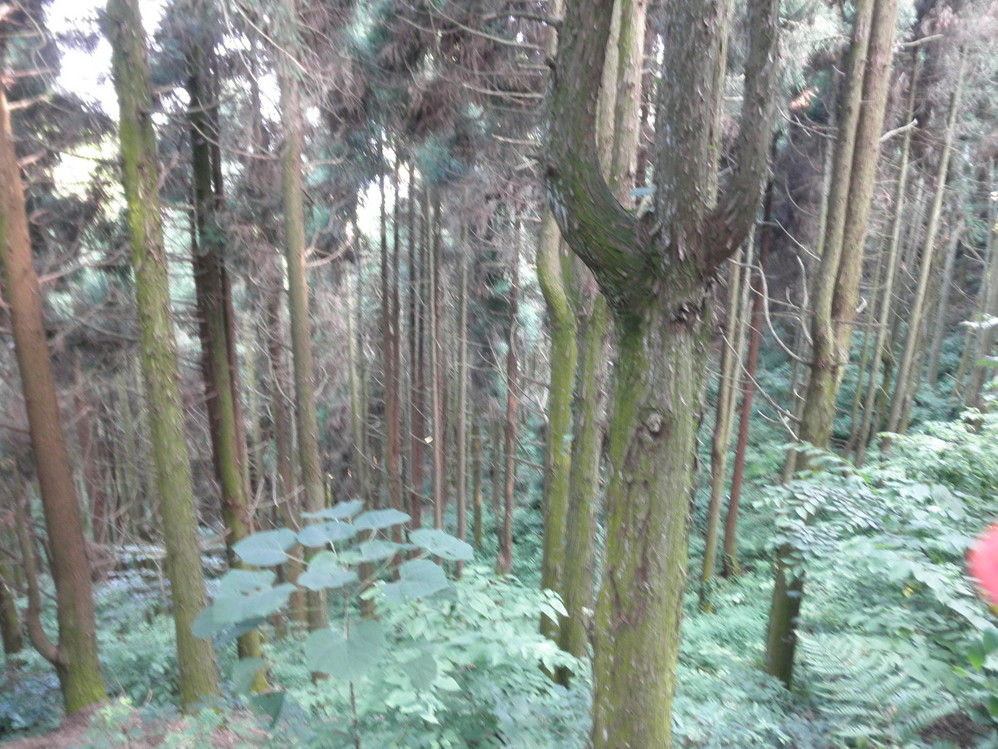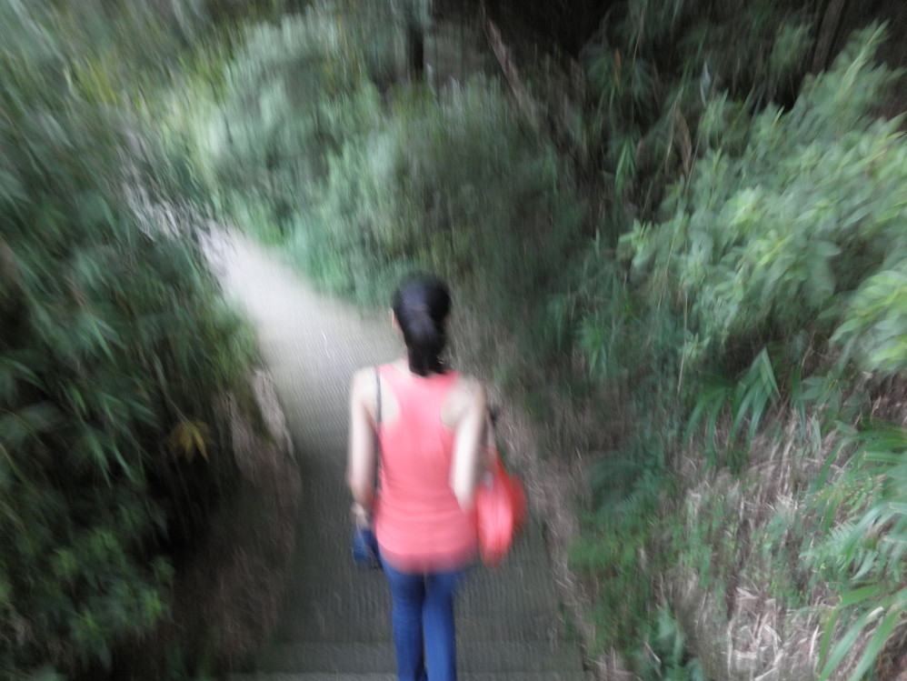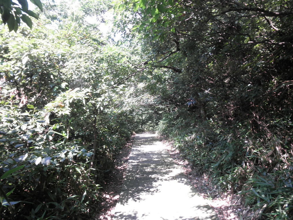 小路走过一半后,两侧就变成杉木林了。依然很安静,全程都没看见我俩以外的人,只有从两旁的废弃垃圾袋,饮料瓶中看出还是有人走过这条路的。整整花了一个小时,走出来就到了车行道,下山速度比上山快多了。上方不远就是磨镜台,我们都太累不想再上山,就放弃了,直接沿着车道往下走。