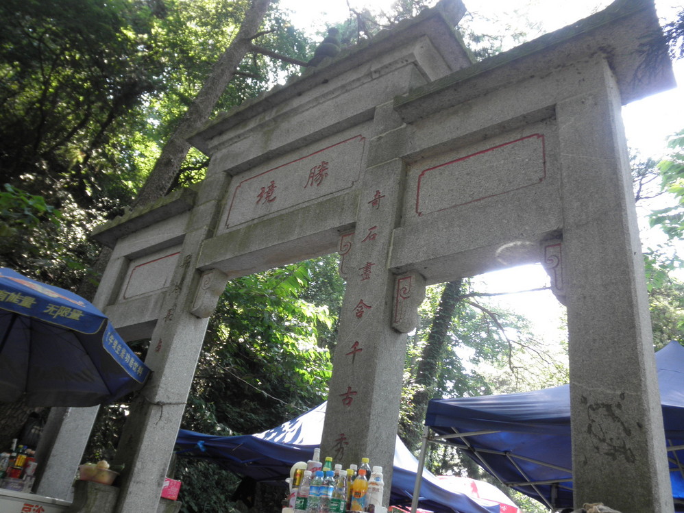 半山亭——胜境牌坊。在这可以换乘索道上山,单程40,双程70。还有很多小摊贩,农家乐可以补给休息。小旅馆也多,想看日出的人可以住在半山亭,半夜直接索道上去,也可以选择住在山顶的上封寺,价格应该会贵一些吧。