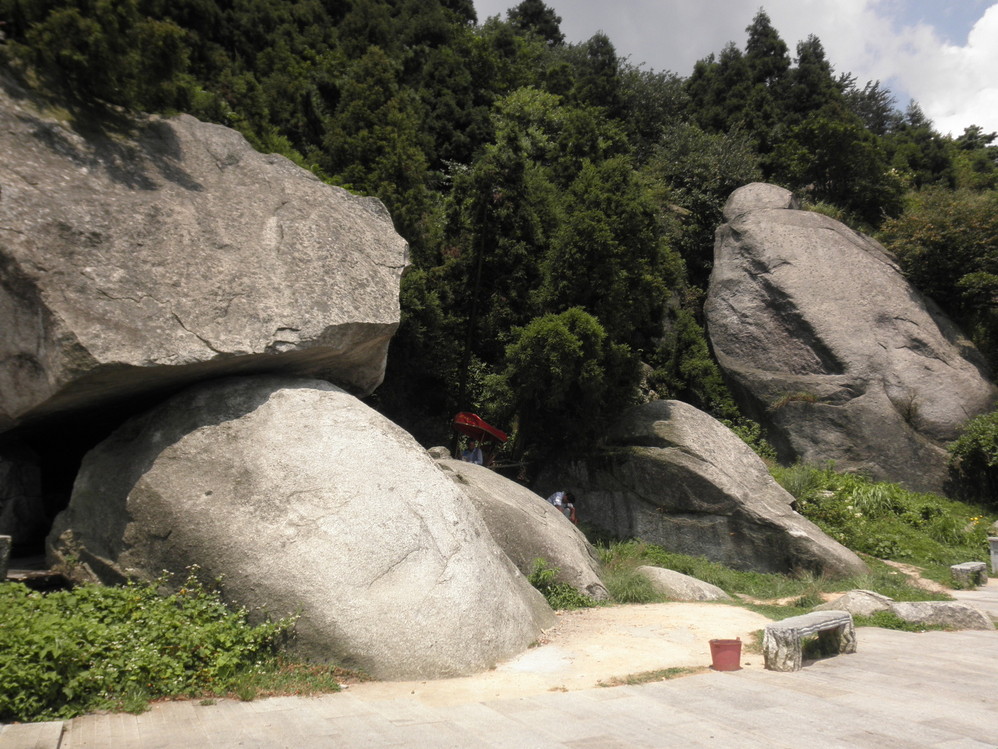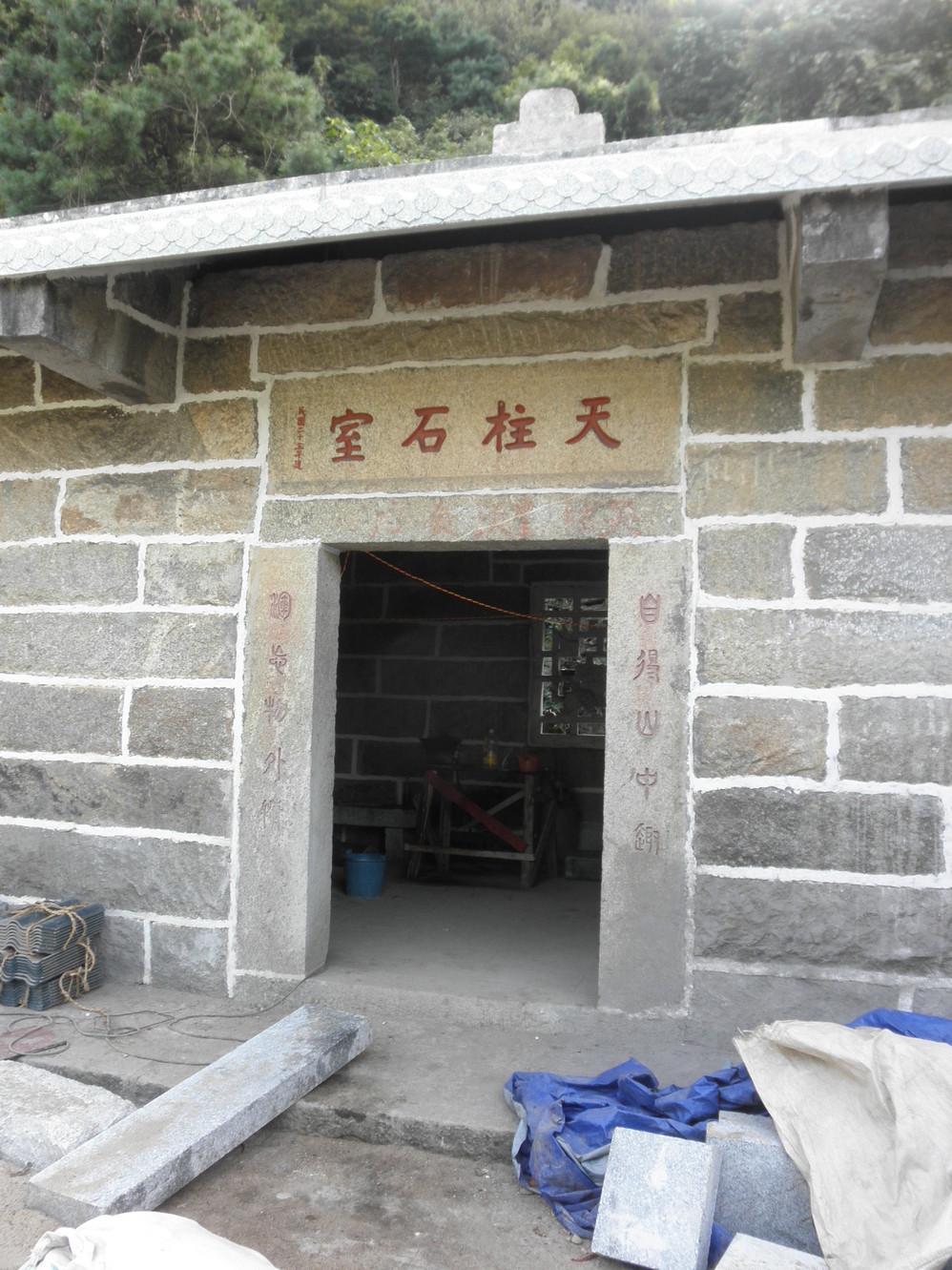 走到一半时——天柱 石室,旁边小字显示民国XX年建,不知什么来历,绕着它转了一圈也没发现有介绍。正在翻修,到处堆满了建筑材料,却不见人。