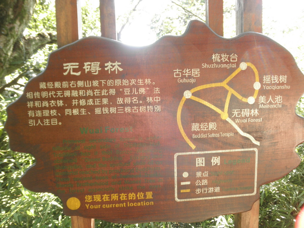 藏经殿旁的原始次生林——无碍林,其中摇钱树,连理枝,同根生三株奇木最出名。