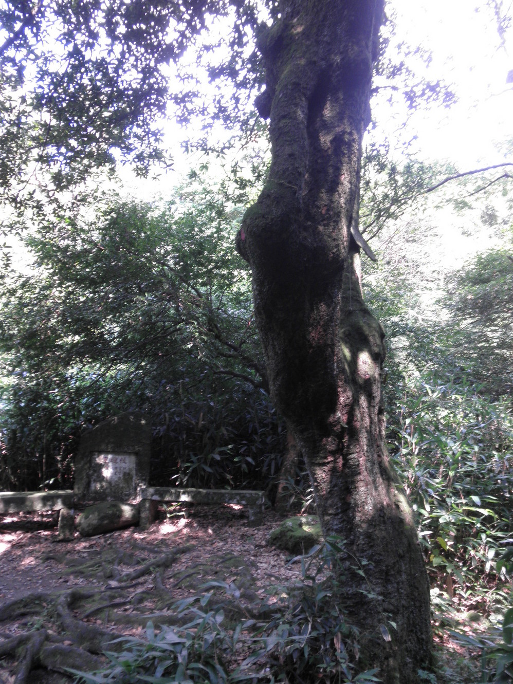 连理枝,后面的石碑年久失修,被青苔侵蚀,字模糊不清,是关于陈妃的传说,哪个朝代记不清了。地面一大片裸露嶙峋的树根,默默记录着历史。